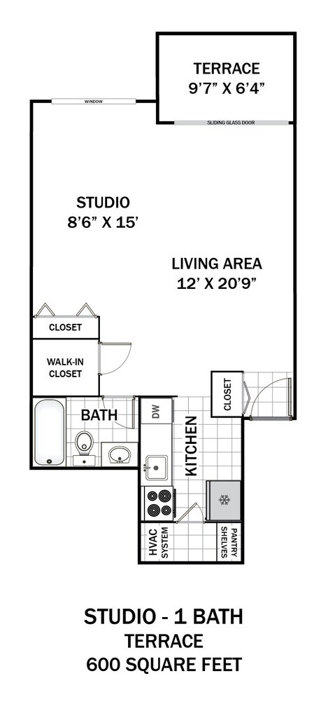 Estudio, 1 Baño, 600 pies²Disponible Dec 12Galería del Modelo