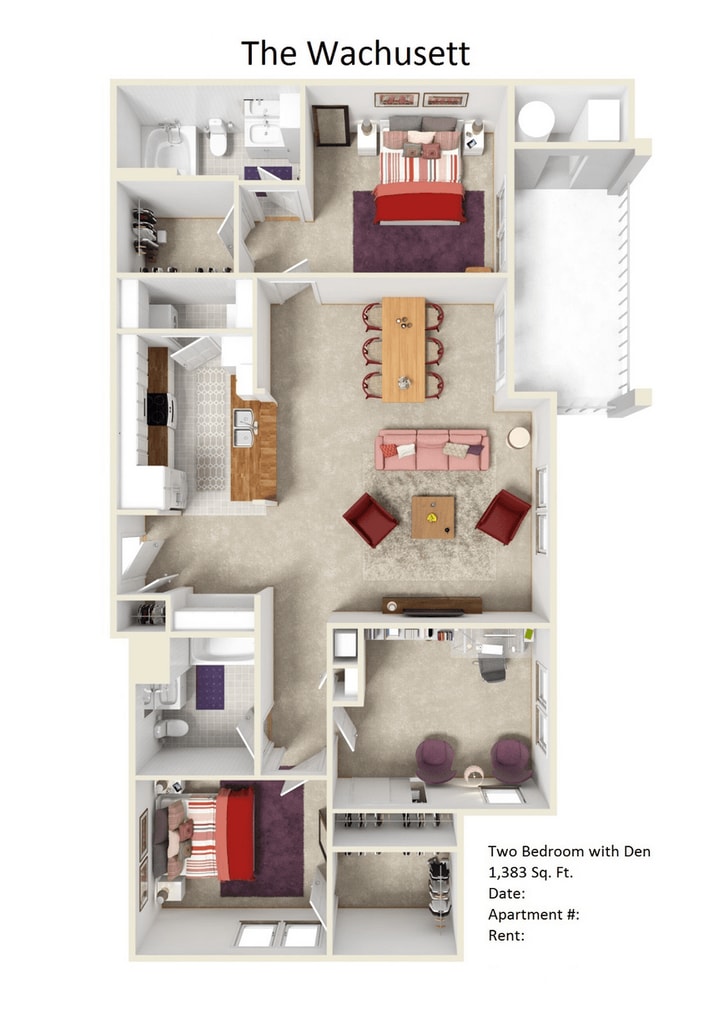 Modelo de apartamento: Wachusett w/DenLlame para Precios2 Dormitorios, 2 Baños, 1383 sq ftNo DisponibleLos planos son representaciones artísticas. Todas las dimensiones son aproximadas. El producto y las especificaciones reales pueden variar en tamaño o detalle. No todas las características están disponibles en cada vivienda en alquiler. Por favor, consulta con un representante para obtener más detalles.