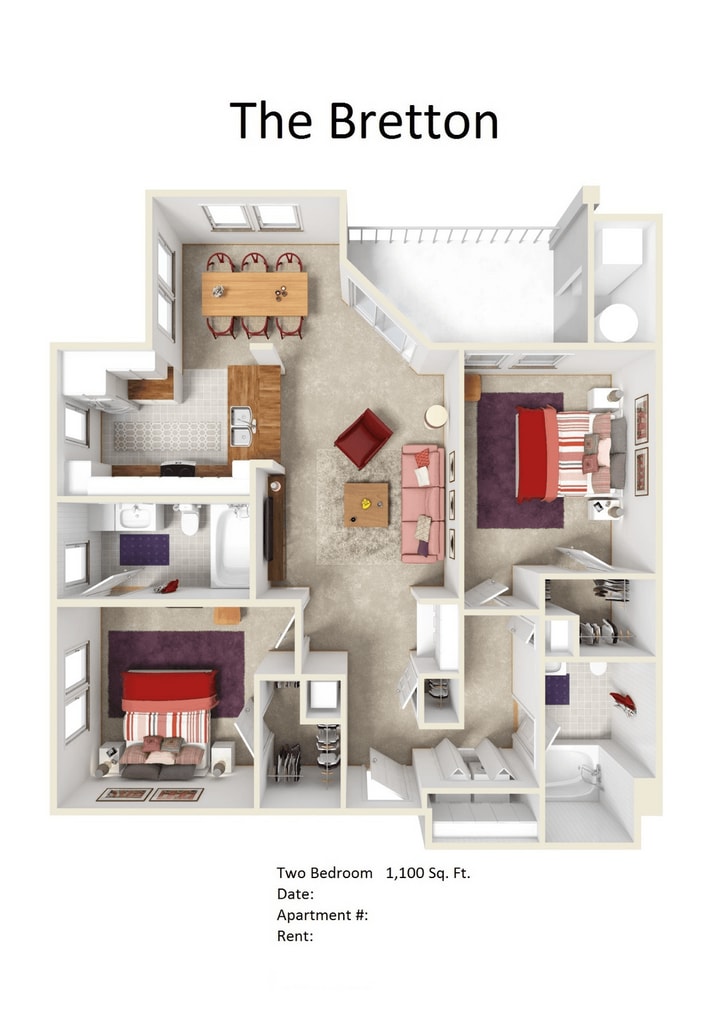 Modelo de apartamento: BrettonDesde $2,6992 Dormitorios, 2 Baños, 1100 sq ftDisponible AhoraLos planos son representaciones artísticas. Todas las dimensiones son aproximadas. El producto y las especificaciones reales pueden variar en tamaño o detalle. No todas las características están disponibles en cada vivienda en alquiler. Por favor, consulta con un representante para obtener más detalles.