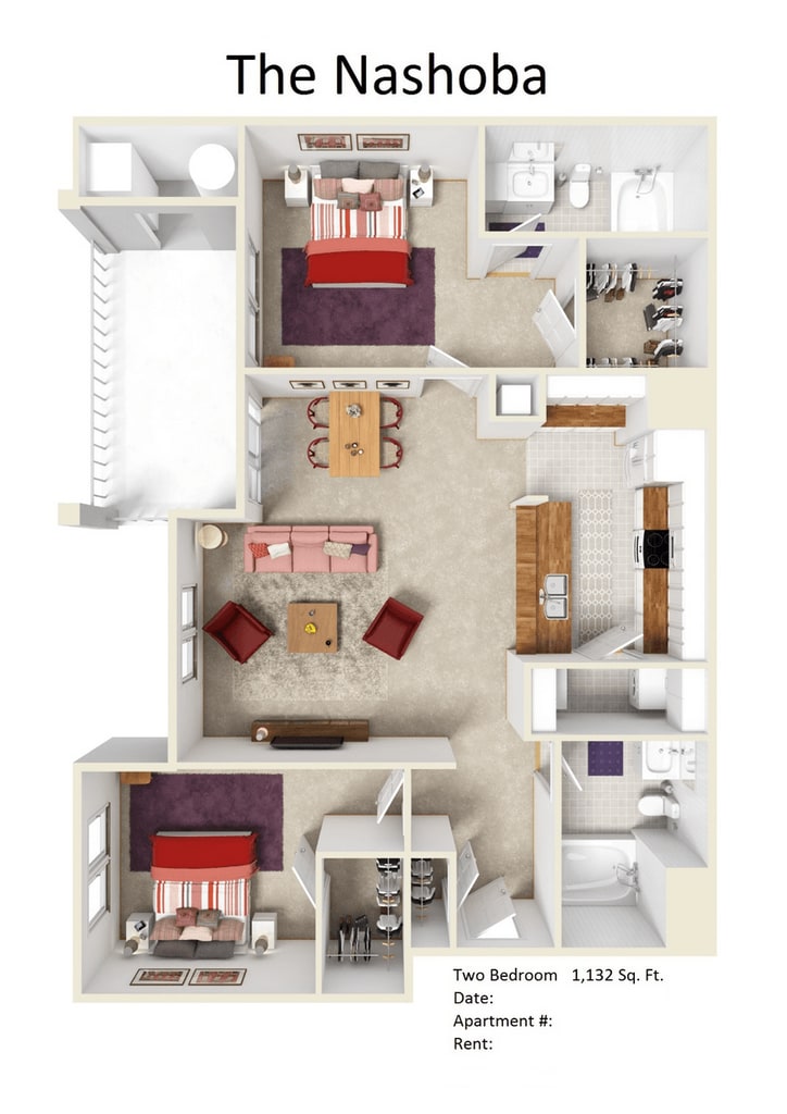 Modelo de apartamento: NashobaLlame para Precios2 Dormitorios, 2 Baños, 1132 sq ftNo DisponibleLos planos son representaciones artísticas. Todas las dimensiones son aproximadas. El producto y las especificaciones reales pueden variar en tamaño o detalle. No todas las características están disponibles en cada vivienda en alquiler. Por favor, consulta con un representante para obtener más detalles.