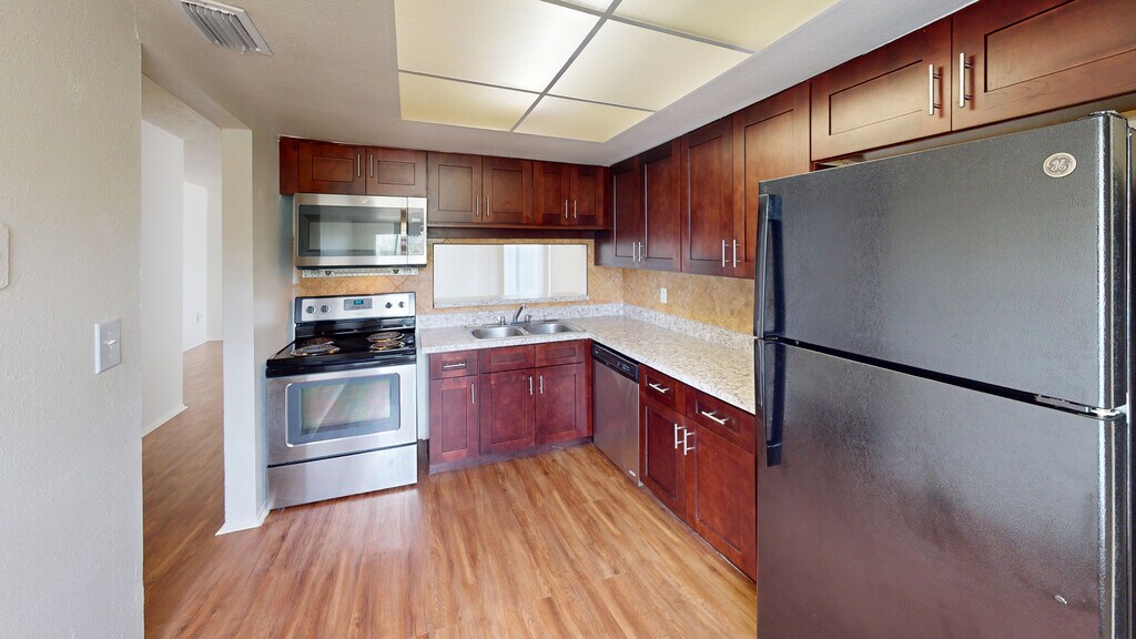 August 11, 2015I think this is a great apartment. There are no stairs and I can have my small dog here for a small fee. I have yet to hear any noise through the walls and I can fit my full size washer dryer in the utility room. I like how large the bedroom is compared to other apartments in the same price range. There are 2 pools and one of them is 8 feet! When I first moved in there was a roof leak which they fixed the very next day. Everyone here has been very nice. It is located on Fowler which can be ...a little busy and the kitchen and bath and tile around the pool could use an update. For the price it is a great size and there is no one above or below you which is nice.Leer MásReseña de Apartments.com
