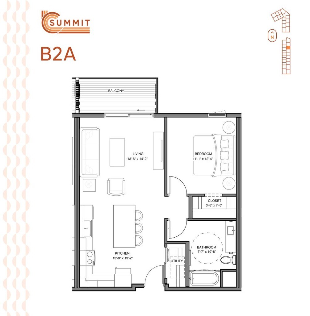 Modelo de apartamento: B2A$1,5501 Dormitorio, 1 Baño, 740 sq ftDisponible Ahora![]()