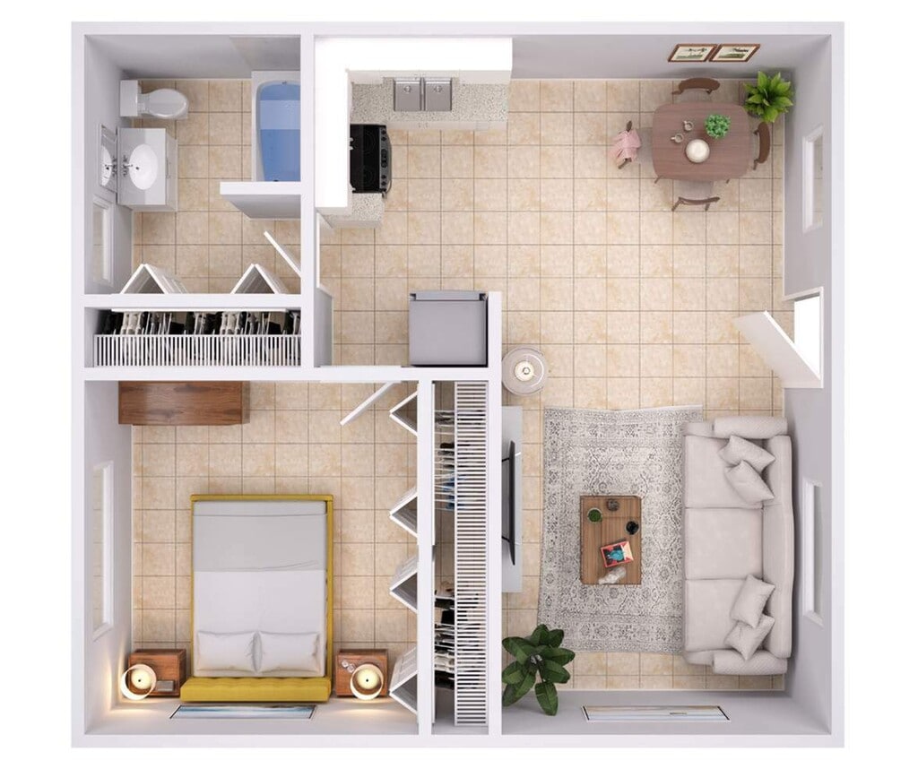 1 Dormitorio, 1 Baño, 625 pies²Disponible AhoraGalería del Modelo