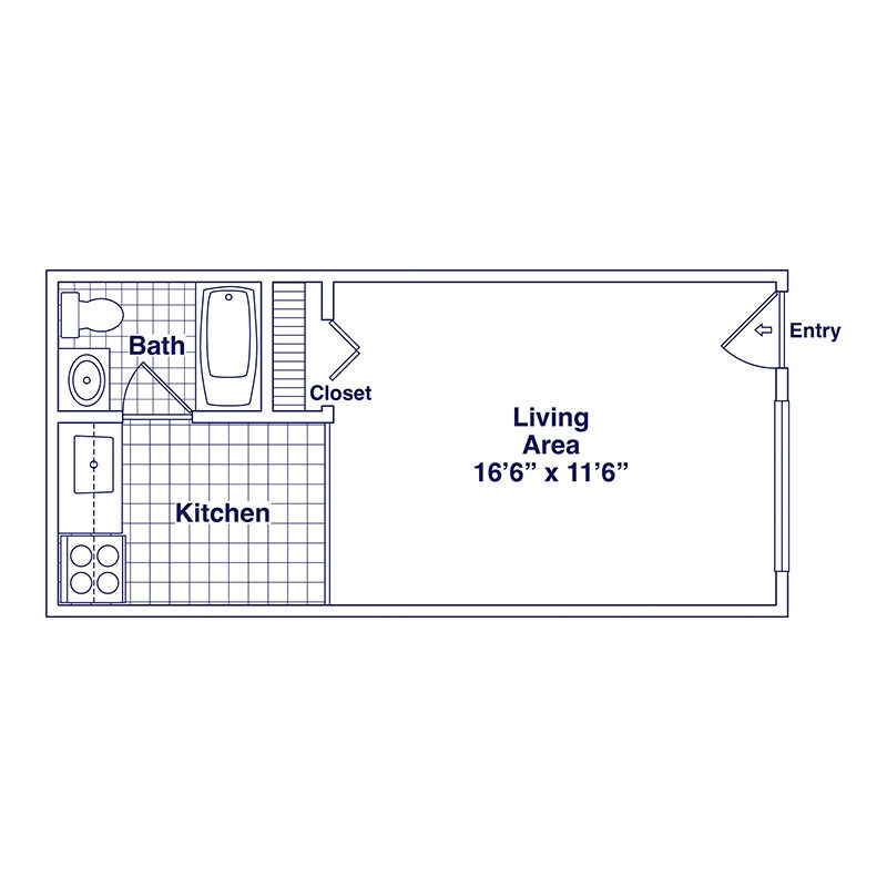 Modelo de apartamento: Studio, One Bath (Sd)Estudio, 1 Baño, 300 sq ftNo Disponible![]()