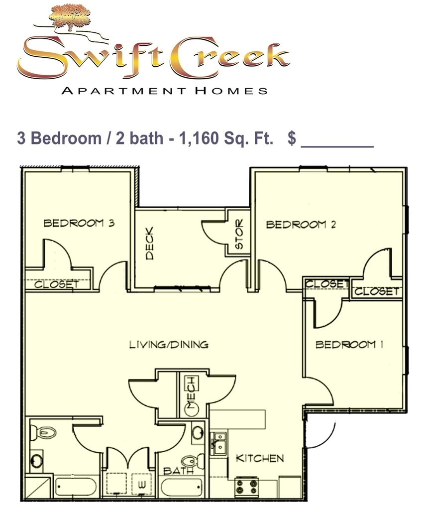 Swift Creek Apartments ofrece apartamentos de 3 Dormitorios y 1,145 pies cuadrados. Aquí está el precio actual y la disponibilidad: