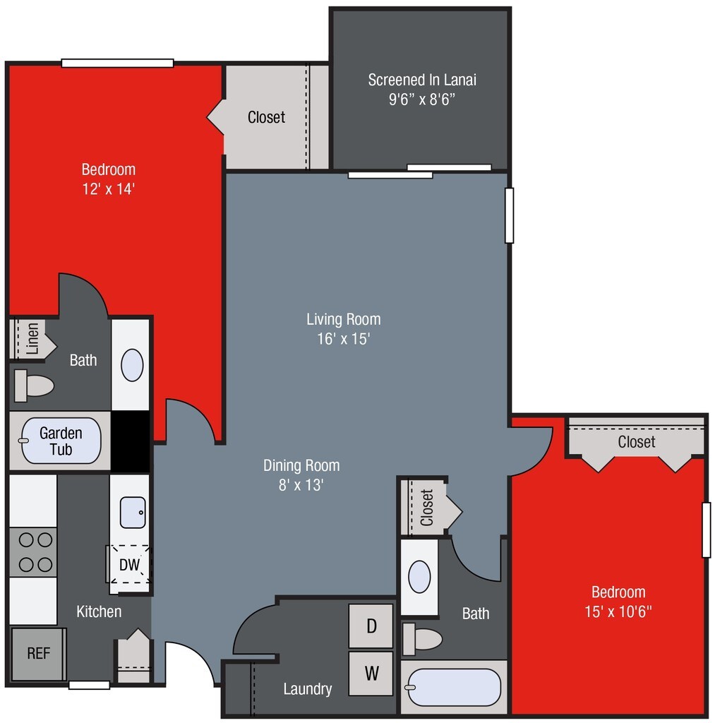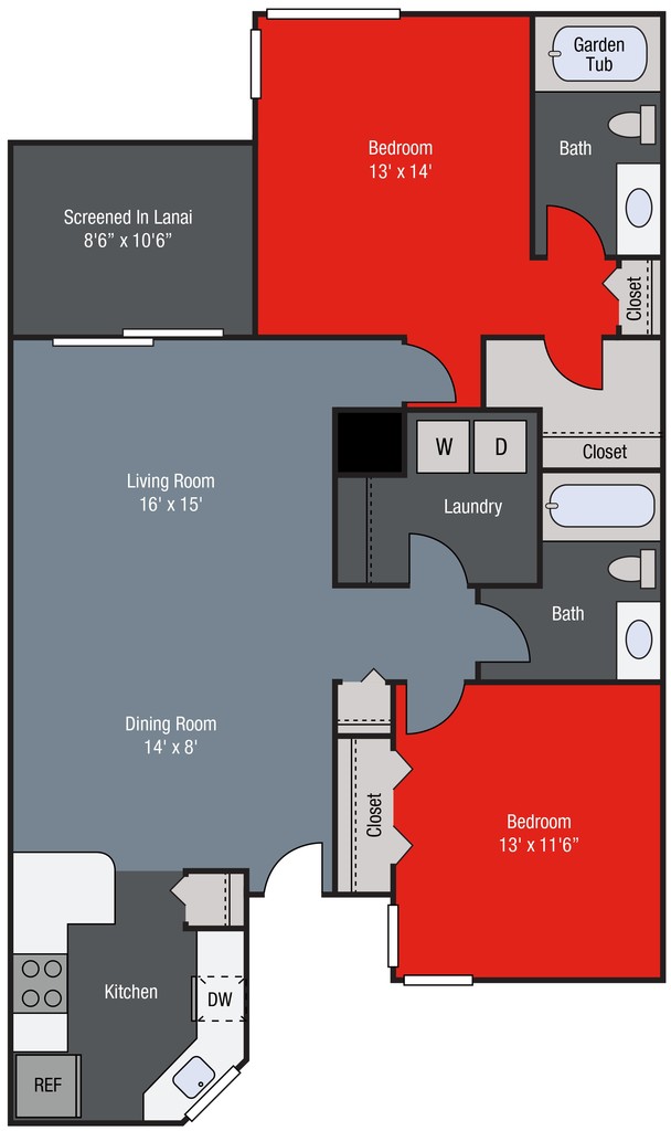 Modelo de apartamento: B1Desde $1,6592 Dormitorios, 2 Baños, 1148 sq ftDisponible Ahora![]()