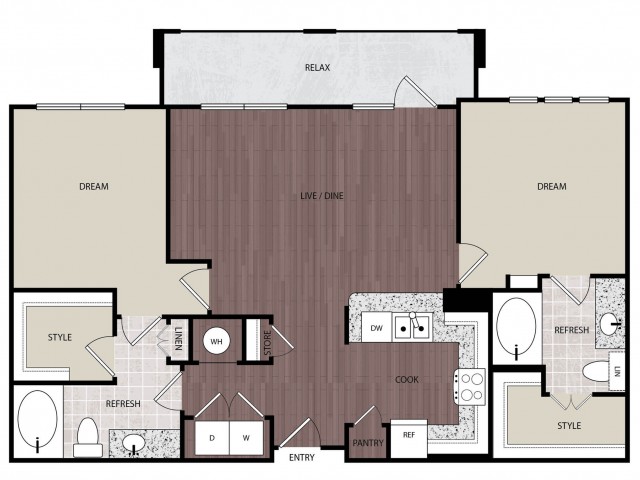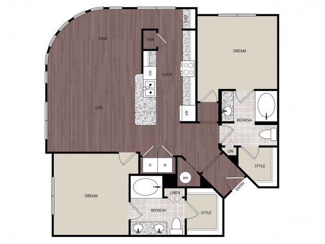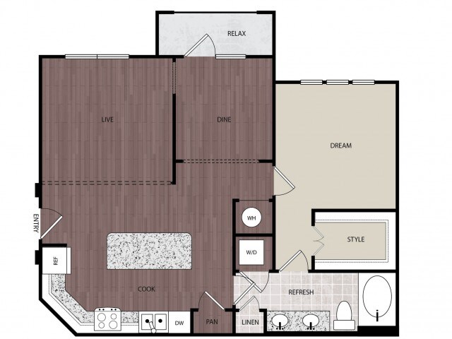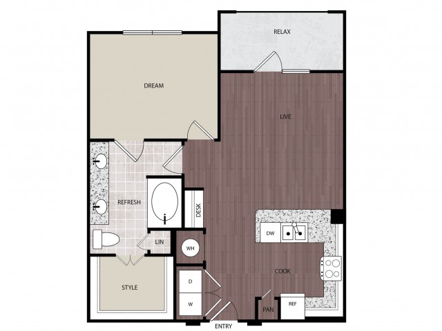 Modelo de apartamento: A1Desde $1,3851 Dormitorio, 1 Baño, 696-708 sq ftDisponible Ahora![]()