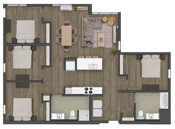 Modelo de apartamento: Four Bed Two BathLlame para Precios4 Dormitorios, 2 Baños, sq ftNo Disponible![]() - Four Bed Two Bath - Plano 1