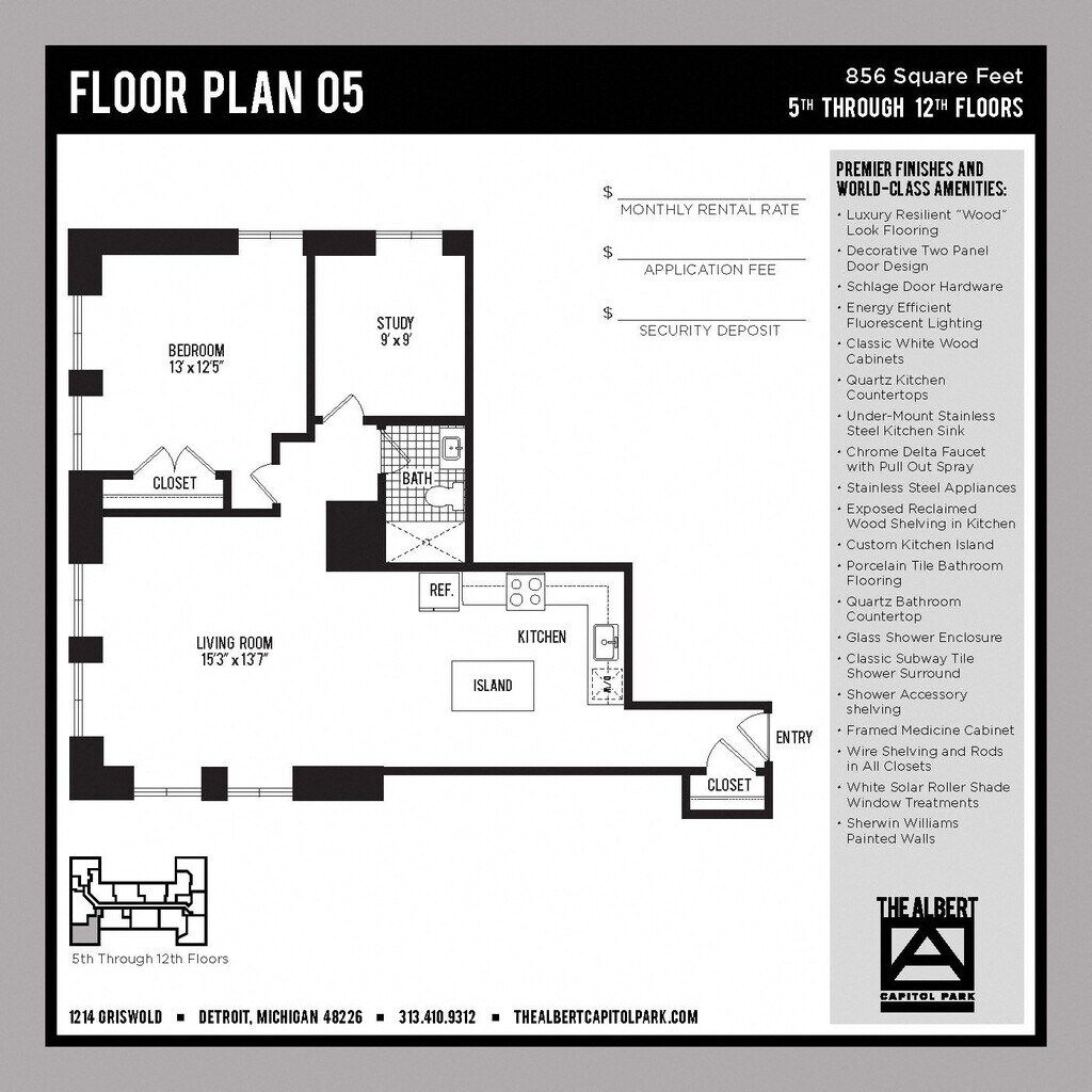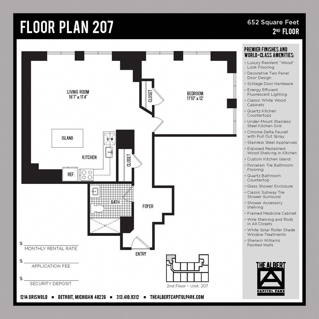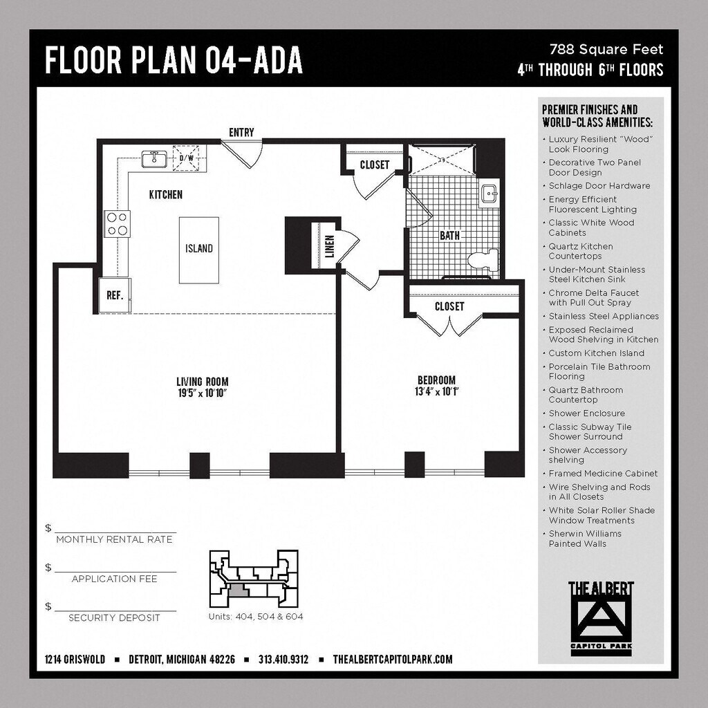 Los apartamentos recientemente renovados de una y dos habitaciones disponen de pisos de lujo de Chevron, espacios grandes y versátiles de entretenimiento, islas de cocina plegables a medida, gabinetes de madera clásicos blancos, encimeras de cuarzo en la cocina, estantes de madera a la vista y Electrodomésticos de acero inoxidable. * El espacio social del 3.º piso cuenta un gimnasio de última generación, una sala de estar comunitaria, un centro de negocios completamente conectado y un increíble balcón al aire libre con vistas a Capitol Park y al centro de la ciudad de Detroit.