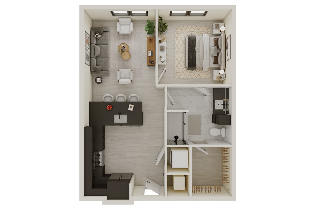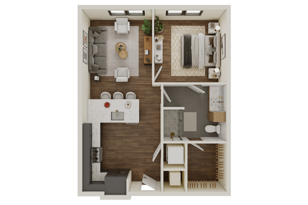 1 Dormitorio, 1 Baño, 590 pies²Disponible AhoraGalería del Modelo