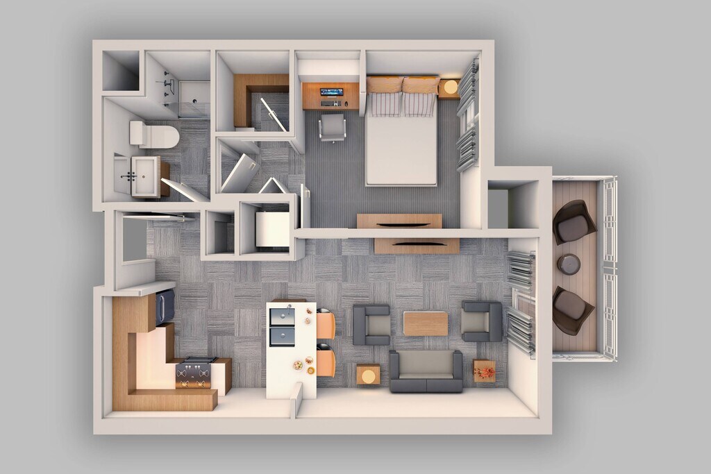 Modelo de apartamento: 1x1 Top Floor1 Dormitorio, 1 Baño, 577 sq ftDisponible August 10, 2026![]()