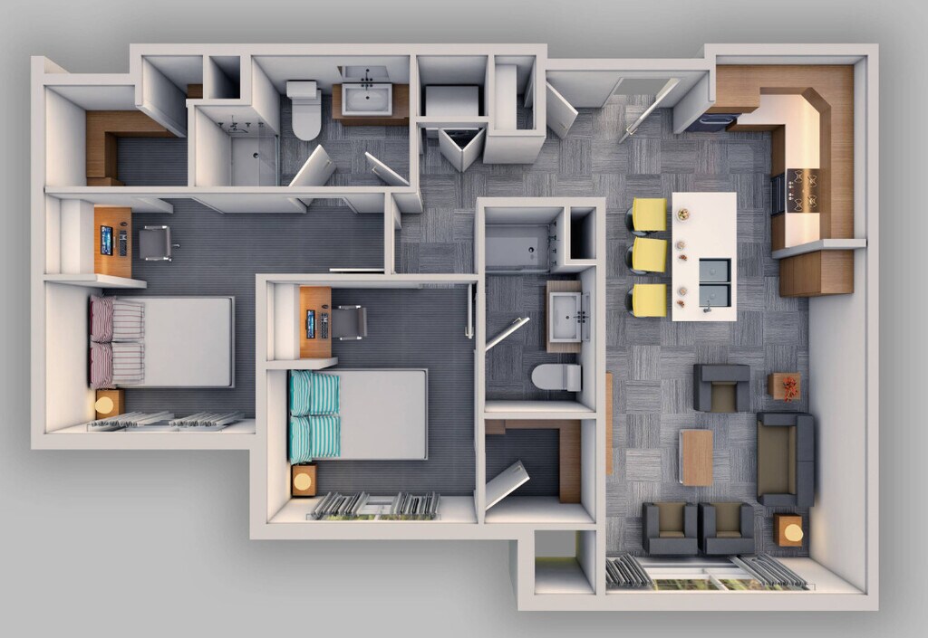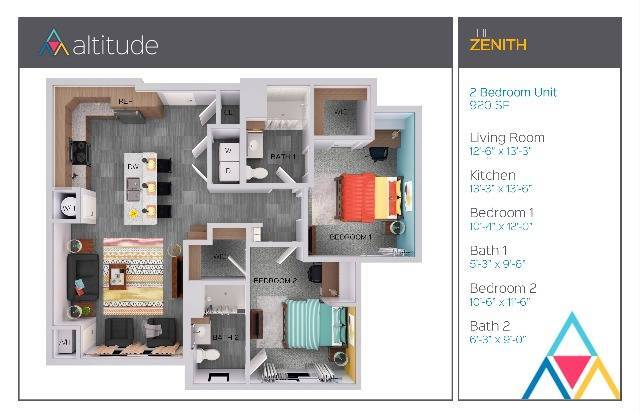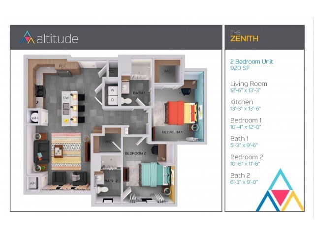 2Bdrm - Plano 1 Unidad de apartamento: PrivateModelo de apartamento: 2Bdrm2 Dormitorios, 2 Baños, 920 sq ftDisponible August 10, 20262x2 Top Floor