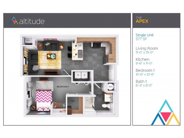 1x1 Top Floor - Plano 1 Unidad de apartamento: PrivateModelo de apartamento: 1x1 Top Floor1 Dormitorio, 1 Baño, 577 sq ftDisponible August 10, 20261Bed/1Bath Terrace Phase II