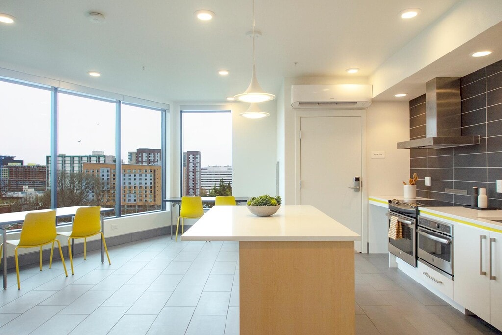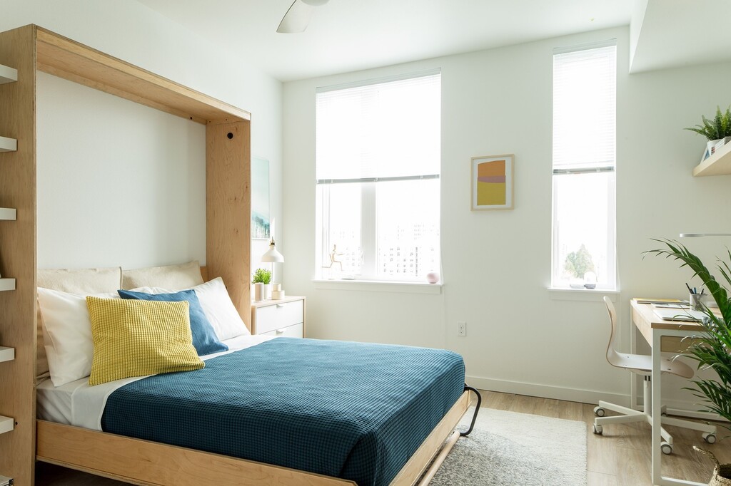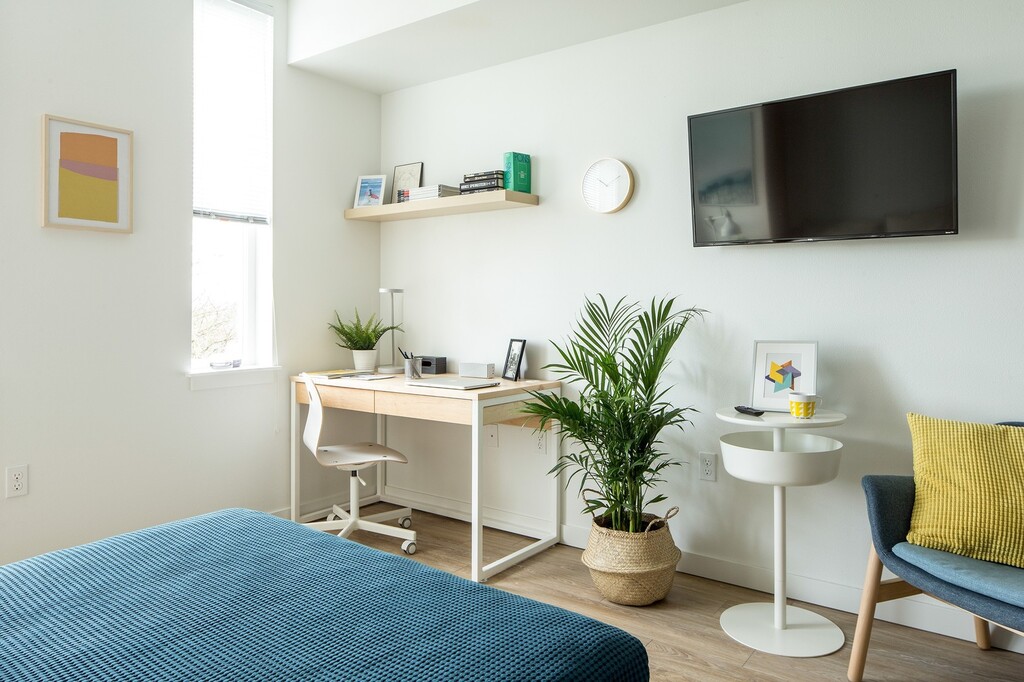 Debe estar inscrito en la escuela al menos a tiempo parcial para vivir en una propiedad de College Housing Northwest. Puede ser una escuela de oficios, una universidad comunitaria o cualquier tipo de educación superior junto con universidades y facultades tradicionales. Ubicado a sólo minutos del campus de la Universidad Estatal de Portland, The Amy fue diseñado pensando en la experiencia de los estudiantes. Varias grandes áreas comunes en todo el edificio promueven la conexión entre la comunidad y los estudiantes, mientras que el estudio privado y los apartamentos de un dormitorio permiten a los residentes tener su espacio personal. A diferencia de otras comunidades de viviendas para estudiantes, alquilamos nuestros apartamentos según el plano de planta y no por la cama. Todos los apartamentos de esta nueva comunidad están amueblados y ofrecen todos los servicios públicos, incluido Internet de alta velocidad, sin cargo para usted. Nuestros planos están amueblados con una cama Murphy y un juego de escritorio para mayor comodidad y conveniencia, junto con ganchos para bicicletas para guardarlos fácilmente. Varios de nuestros modernos apartamentos llenos de luz también ofrecen una vista espectacular al centro de Portland y a West Hills. Un patio maravillosamente diseñado es el lugar perfecto para relajarse con amigos mientras disfruta de la parrilla y la hoguera. El Amy también ofrece cocinas pequeñas y varias cocinas comunitarias para reunirse con los vecinos. También le encantarán las cuatro cómodas instalaciones de lavandería con acceso mediante llavero para que las tareas del fin de semana sean aún más simples. The Amy está ubicado en un vecindario residencial bien diseñado, conocido por el parque Washington, repleto de atracciones, junto con el zoológico de Oregón, el sereno jardín japonés de Portland y el jardín Rose. Estará a pasos del servicio de traslado a Portland Community College, Lewis and Clark College y Oregon Health Sciences University. También estamos a poca distancia a pie de las líneas MAX naranja y amarilla. Recoja los alimentos básicos en uno de nuestros supermercados cercanos, tome un café con leche en las cafeterías locales que elija o aventúrese en uno de los cafés únicos cercanos. Al hacer tu hogar en The Amy, tendrás fácil acceso a todo lo que la ciudad tiene para ofrecer. Además de ser una organización sin ánimo de lucro, la sostenibilidad es muy importante para nosotros. Utilizamos energía eólica 100 % limpia en todo momento, nuestros equipos de custodia solo utilizan productos de limpieza ecológicos. Los aireadores y cabezales de ducha de bajo flujo se instalan en todos los baños para reducir el consumo de agua, y nuestro techo verde y viviente proporciona gestión de aguas pluviales y es eficiente energéticamente. Las fotografías son solo con fines ilustrativos.