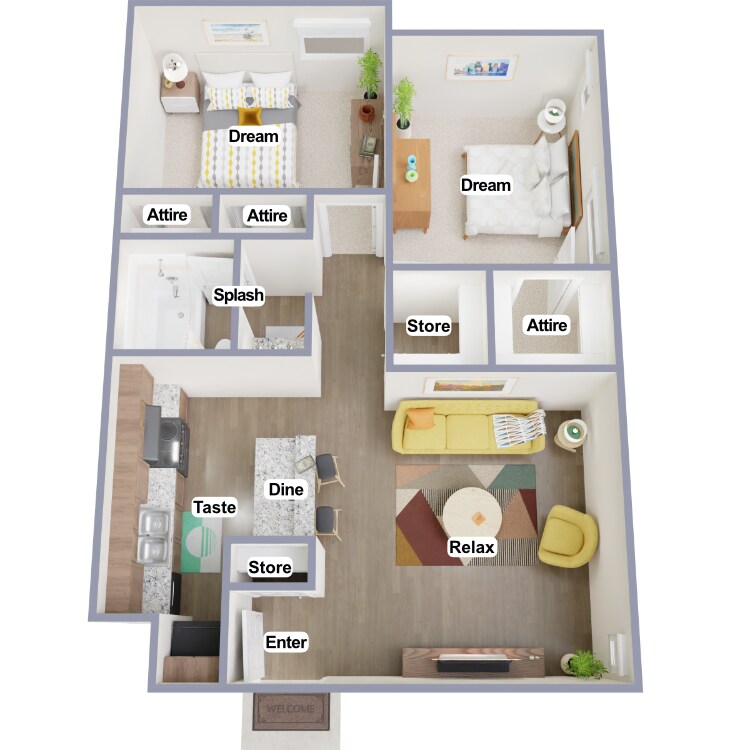 Modelo de apartamento: B1Desde $9372 Dormitorios, 1 Baño, 780 sq ftDisponible Ahora![]()