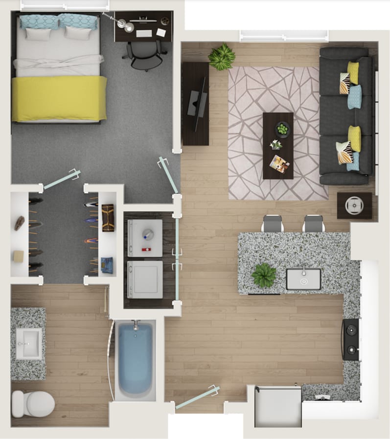 Modelo de apartamento: A1$1,7791 Dormitorio, 1 Baño, 558 sq ftDisponible Ahora![]()