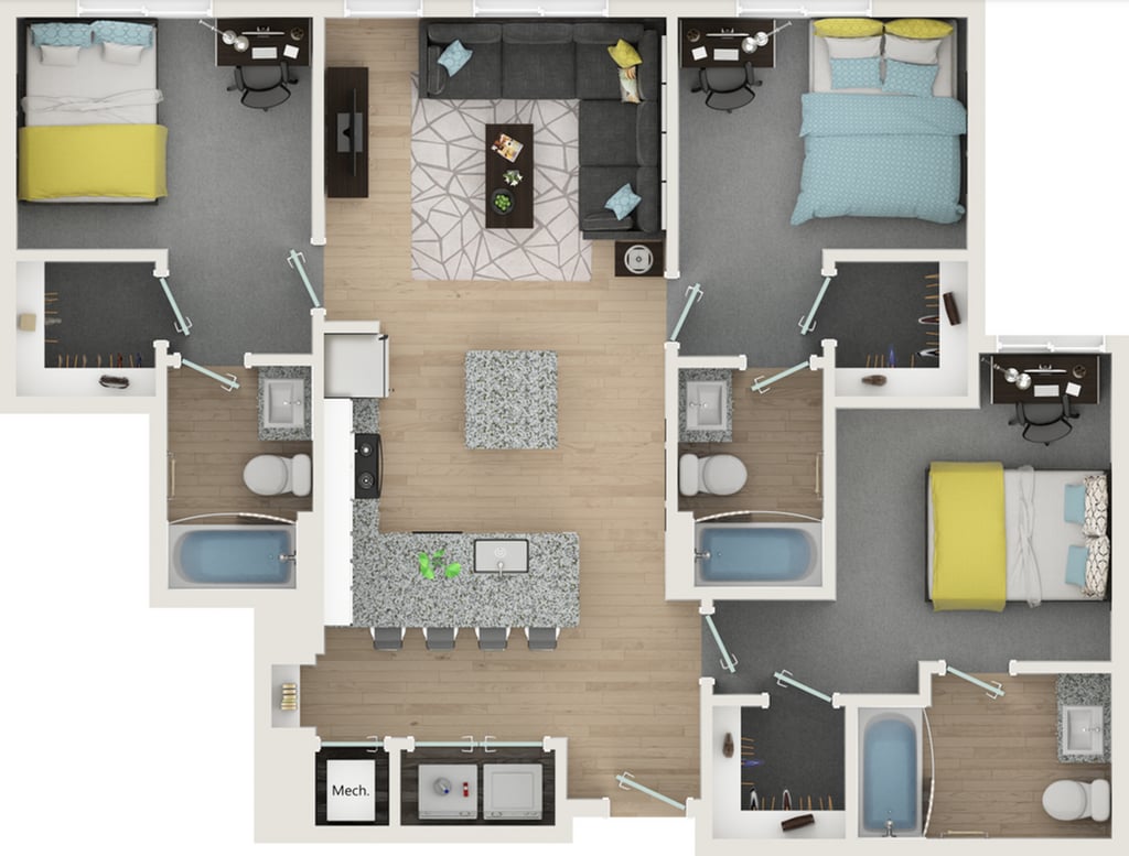 Modelo de apartamento: D1Desde $9994 Dormitorios, 4 Baños, 1399 sq ftDisponible Ahora![]()