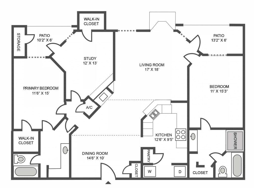 Modelo de apartamento: 1ADesde $1,1001 Dormitorio, 1 Baño, 640 sq ftDisponible Ahora![]()