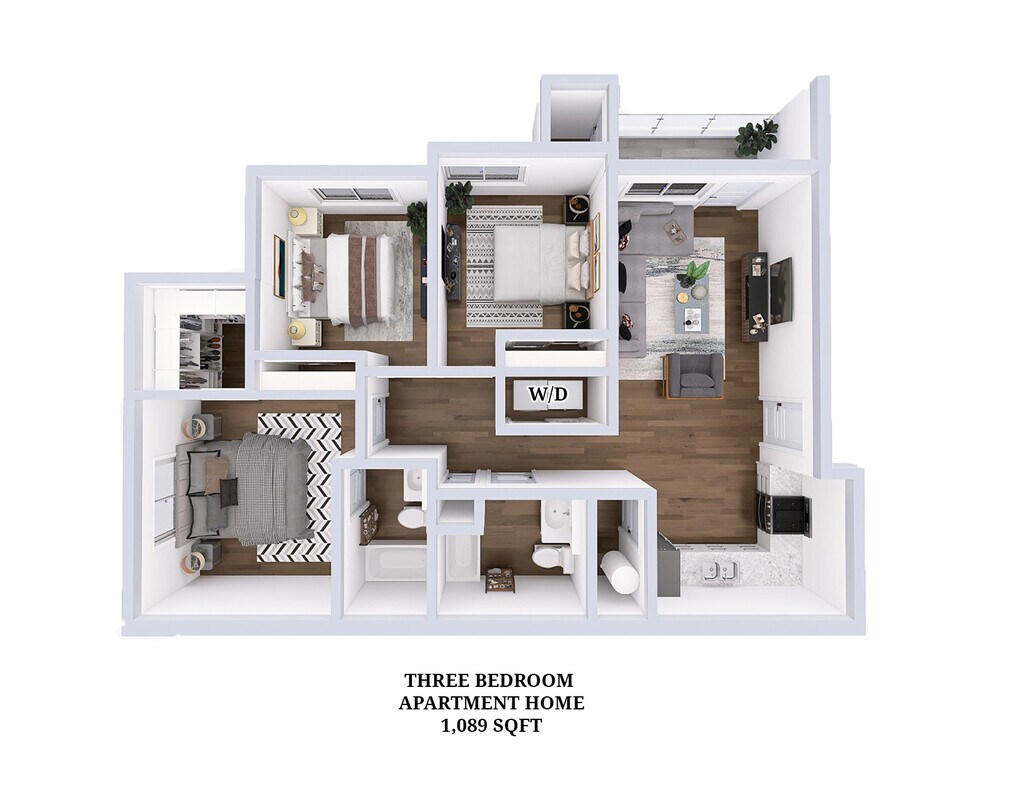 Modelo de apartamento: 3B3 Dormitorios, 2 Baños, 1089 sq ftDisponible December 6, 2025PlanosFotos![]()