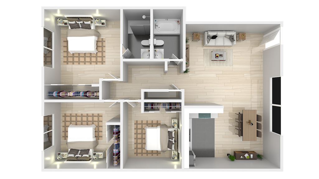 Modelo de apartamento: Three Bedroom3 Dormitorios, 2 Baños, 1100 sq ftNo Disponible![]()