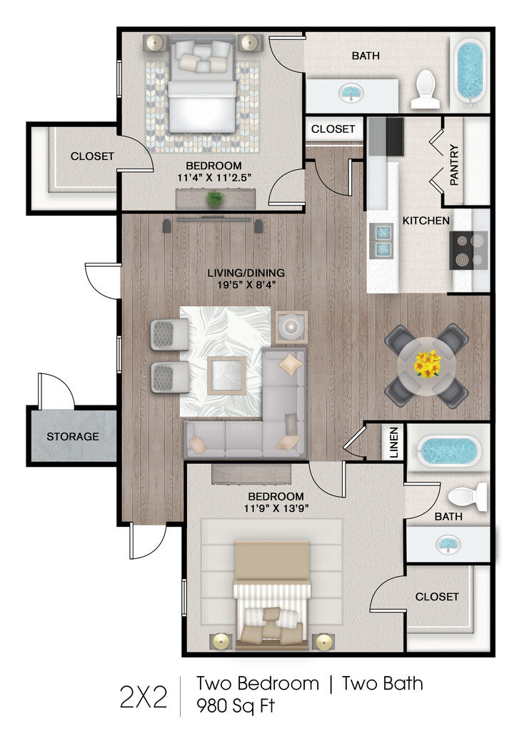 2 Dormitorios, 2 Baños, 980 pies²Disponible AhoraGalería del Modelo