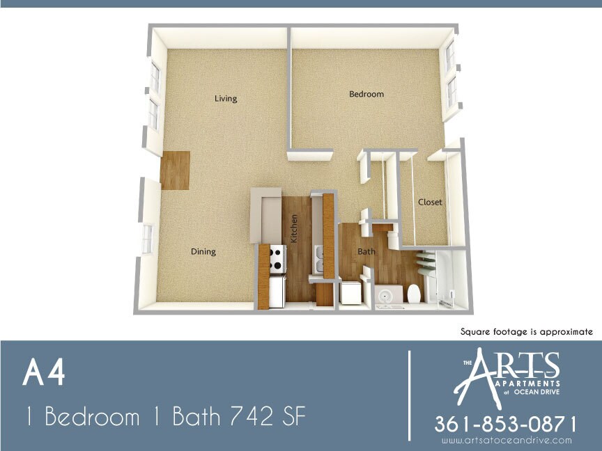 A4 - Imagen 5 Unidad de apartamento: 4-314Modelo de apartamento: A41 Dormitorio, 1 Baño, 742 sq ftDisponible April 27, 2026Plano: A2