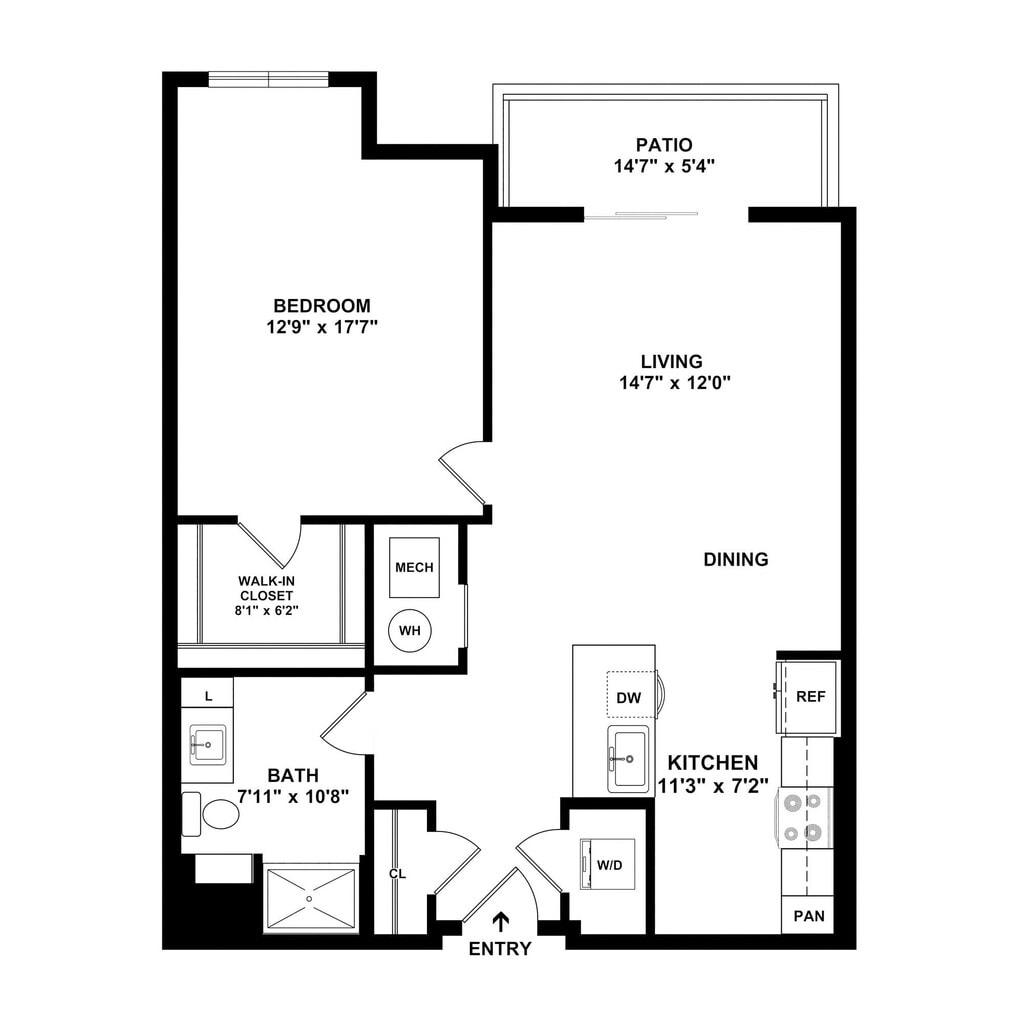 One Bed One Bath 1A.5 - Plano 1 Los planos son representaciones artísticas. Todas las dimensiones son aproximadas. El producto y las especificaciones reales pueden variar en tamaño o detalle. No todas las características están disponibles en cada vivienda en alquiler. Por favor, consulta con un representante para obtener más detalles.