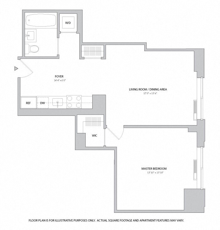 Unidad de apartamento: 0310Modelo de apartamento: 1X1 - A51 Dormitorio, 1 Baño, 595 sq ftDisponible AhoraUnidad: 0310 - Plano 1 1X1 - A13