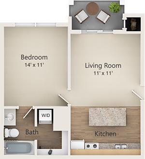 Modelo de apartamento: The Palmer - A1ADesde $1,1411 Dormitorio, 1 Baño, 555 sq ftDisponible AhoraPlanosFotos![]()