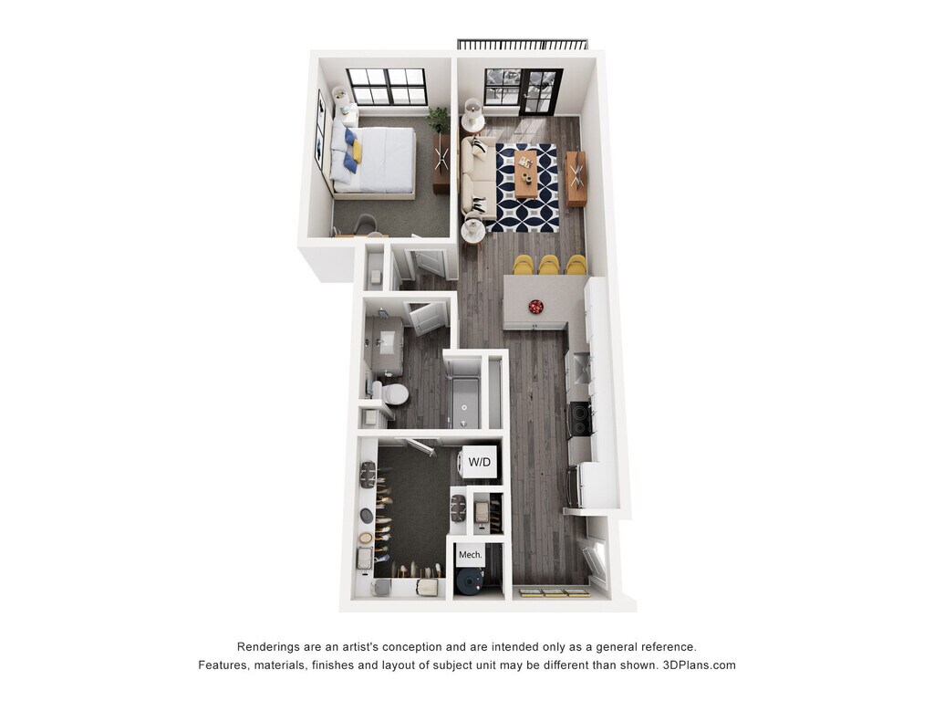 Modelo de apartamento: Compass - A1.E1 Dormitorio, 1 Baño, 655 sq ftDisponible June 17, 2026![]()