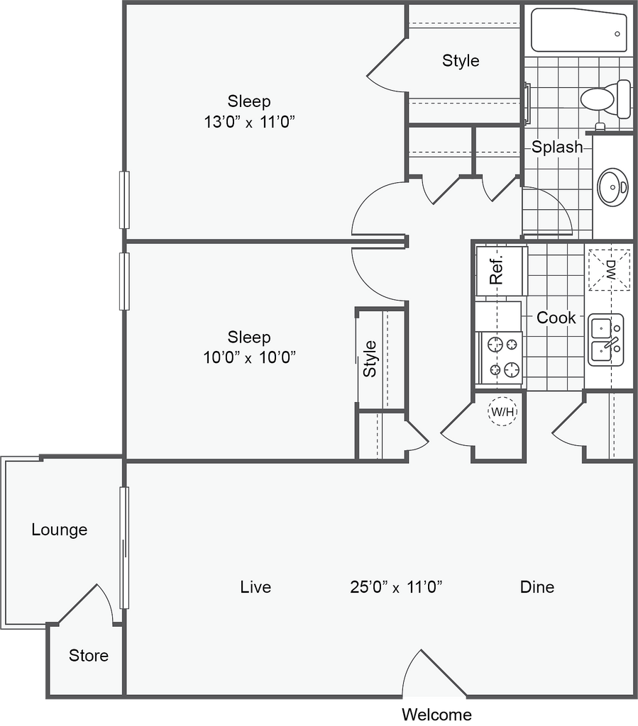Modelo de apartamento: B1Desde $1,2052 Dormitorios, 1 Baño, 806 sq ftDisponible AhoraLos planos son representaciones artísticas. Todas las dimensiones son aproximadas. El producto y las especificaciones reales pueden variar en tamaño o detalle. No todas las características están disponibles en cada vivienda en alquiler. Por favor, consulta con un representante para obtener más detalles.