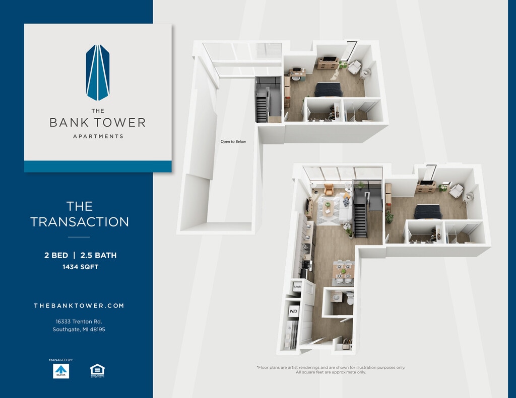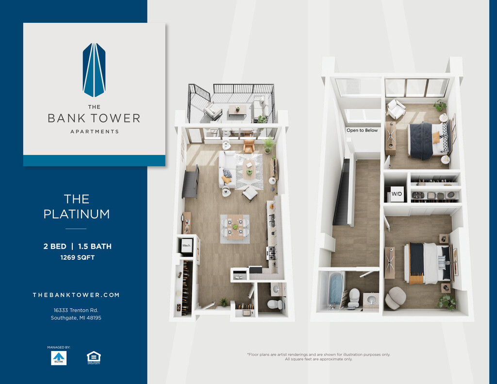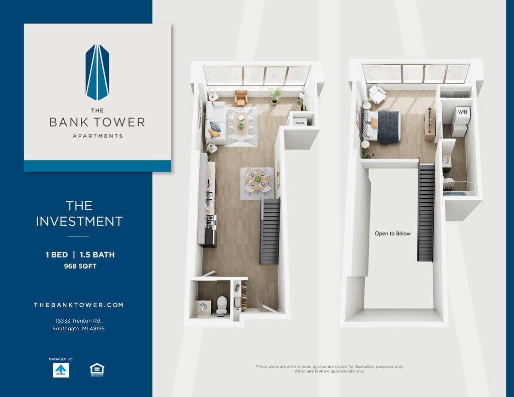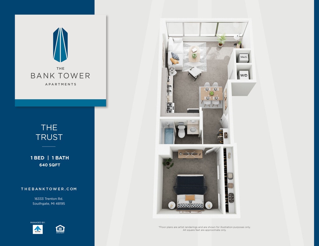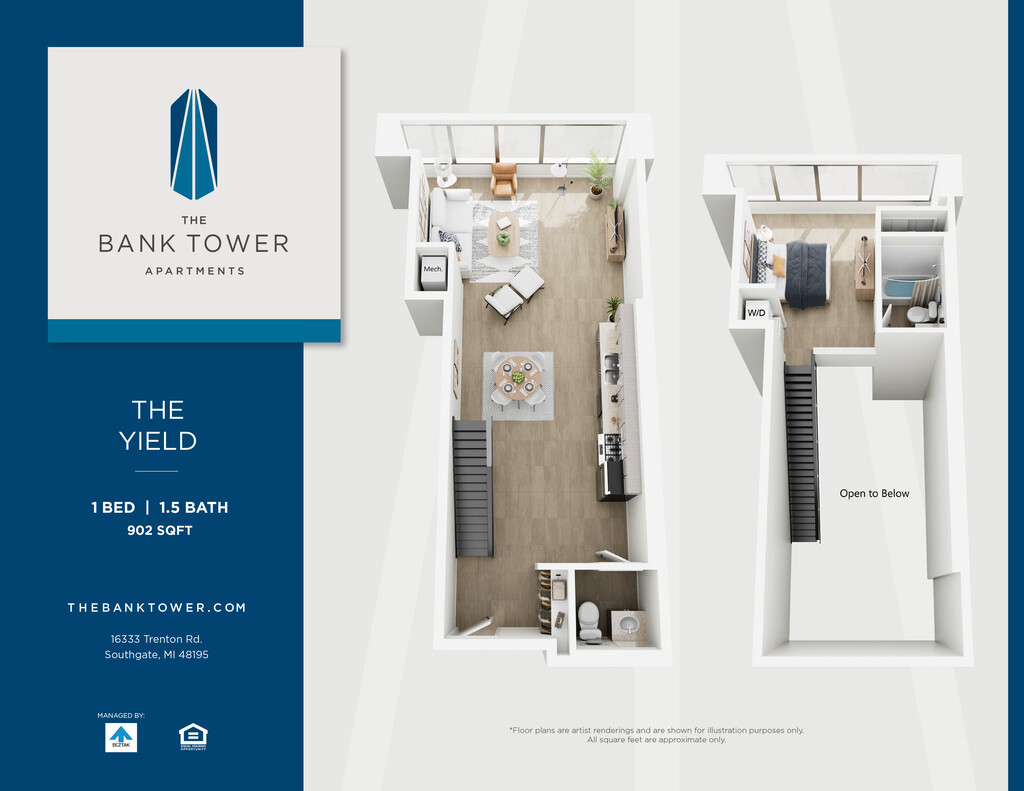 This property is managed by Beztak, 2025 recipient of the US Best Managed Companies for the fifth year, sponsored by Deloitte Private and The Wall Street Journal. Call and let us tell you why!Soaring 14 stories above the green, connected neighborhoods of Southgate, The Bank Tower Apartments offer a fresh take on Downriver living just minutes from downtown Detroit.Built in 1972 as the Security Bank and Trust building, our stylish community is more than the citys tallest building and a local landmark. Enjoy panoramic views from our renovated studio, one- and two-bedroom homes and two-story penthouses. Take advantage of our amenities: a state-of-the-art fitness center, community plaza with pool, lounge areas, and outdoor spaces. Theres even an EV charging station in one of the original drive-up bank tellers. If youre looking for an iconic address to call home, just look up.