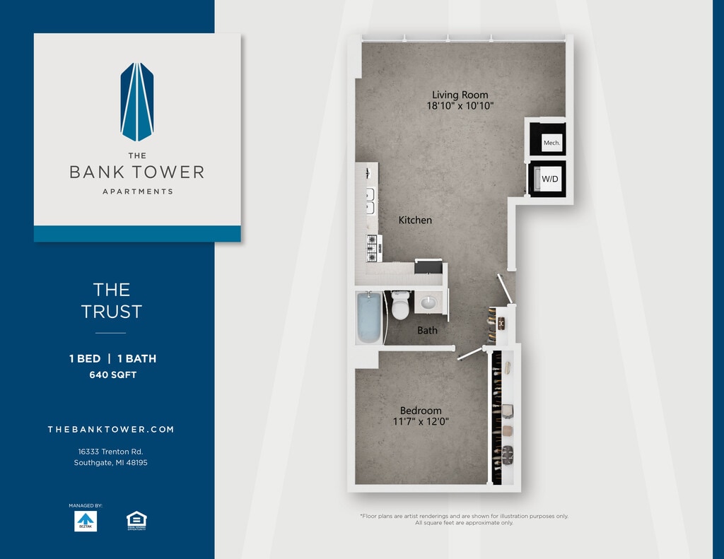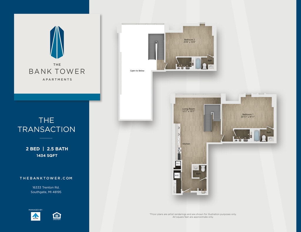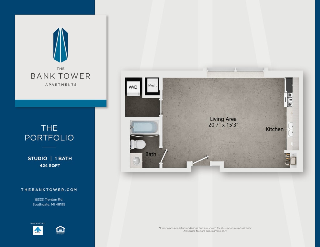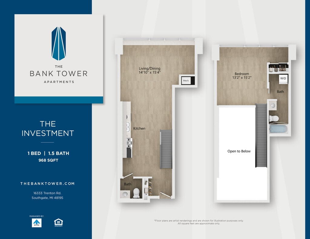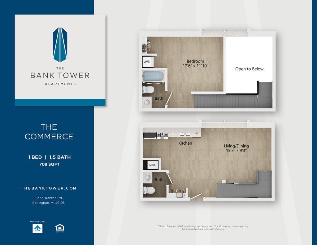 This property is managed by Beztak, 2025 recipient of the US Best Managed Companies for the fifth year, sponsored by Deloitte Private and The Wall Street Journal. Call and let us tell you why!Soaring 14 stories above the green, connected neighborhoods of Southgate, The Bank Tower Apartments offer a fresh take on Downriver living just minutes from downtown Detroit.Built in 1972 as the Security Bank and Trust building, our stylish community is more than the citys tallest building and a local landmark. Enjoy panoramic views from our renovated studio, one- and two-bedroom homes and two-story penthouses. Take advantage of our amenities: a state-of-the-art fitness center, community plaza with pool, lounge areas, and outdoor spaces. Theres even an EV charging station in one of the original drive-up bank tellers. If youre looking for an iconic address to call home, just look up.