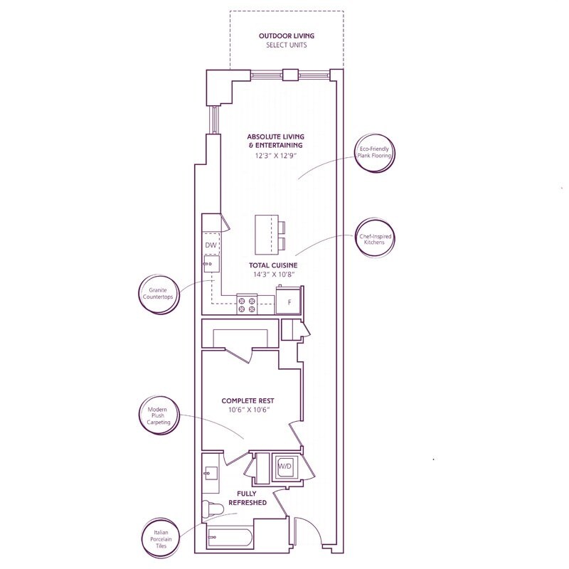 1 Bed - 1 Bath | A02F (Pocket Office by Ori) - Plano 1 Los planos son representaciones artísticas. Todas las dimensiones son aproximadas. El producto y las especificaciones reales pueden variar en tamaño o detalle. No todas las características están disponibles en cada vivienda en alquiler. Por favor, consulta con un representante para obtener más detalles.