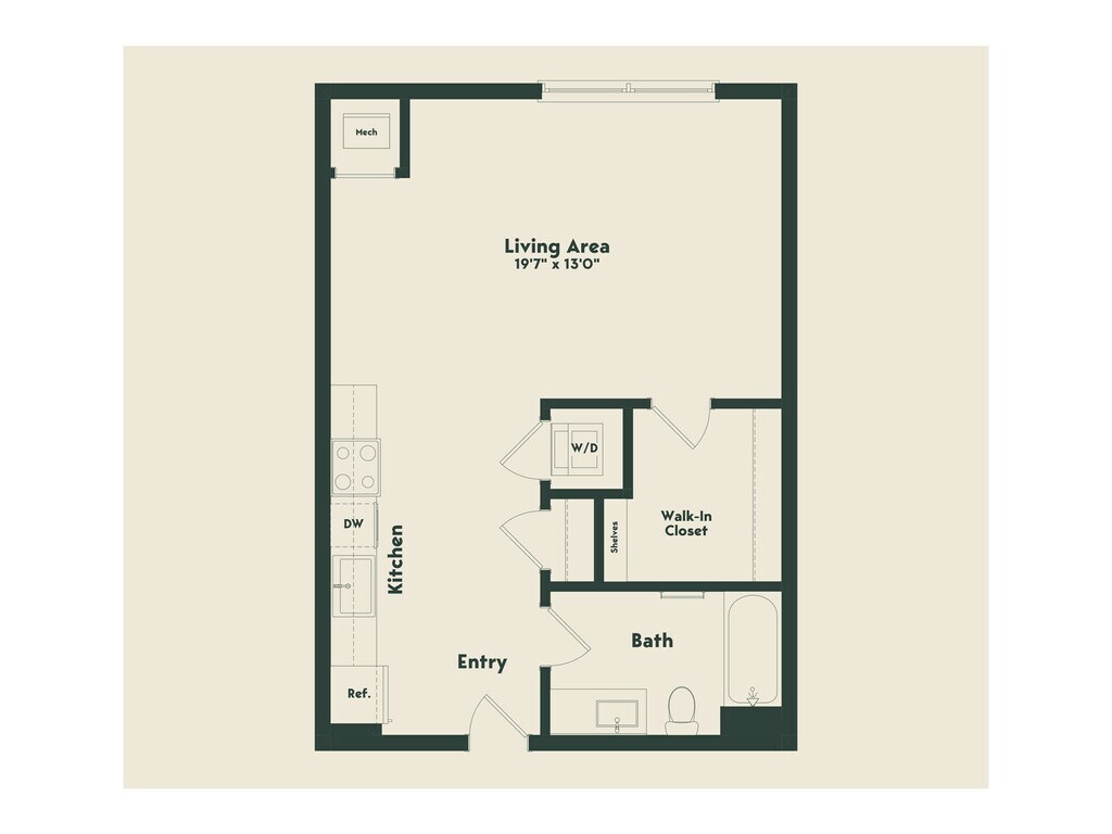 Modelo de apartamento: A-1Desde $1,586Estudio, 1 Baño, 568 sq ftDisponible AhoraLos planos son representaciones artísticas. Todas las dimensiones son aproximadas. El producto y las especificaciones reales pueden variar en tamaño o detalle. No todas las características están disponibles en cada vivienda en alquiler. Por favor, consulta con un representante para obtener más detalles.