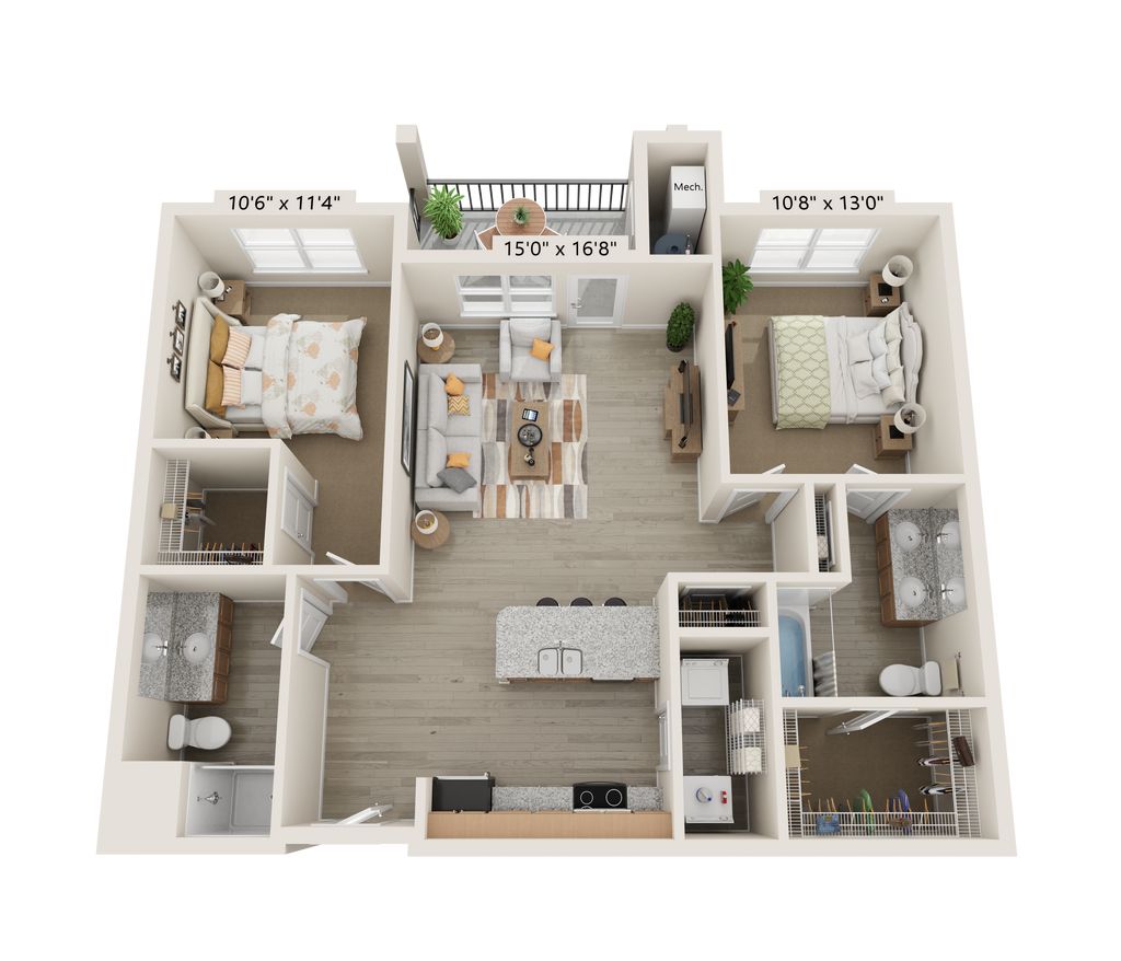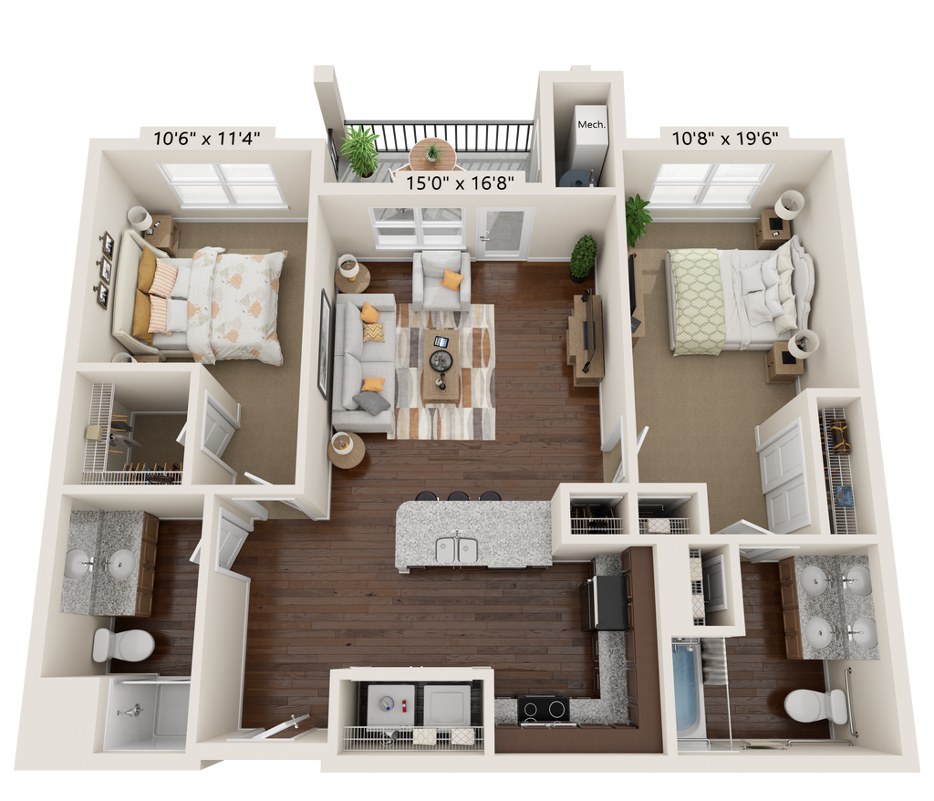 Modelo de apartamento: River BirchDesde $1,7102 Dormitorios, 2 Baños, 1074 sq ftDisponible Ahora![]()