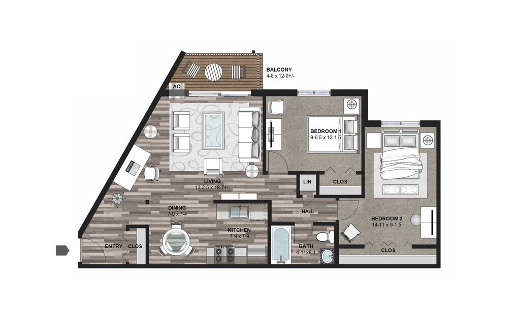 2 Dormitorios, 1 Baño, 788 pies²Precio Mensual TotalDisponible February 1, 2026Galería del Modelo