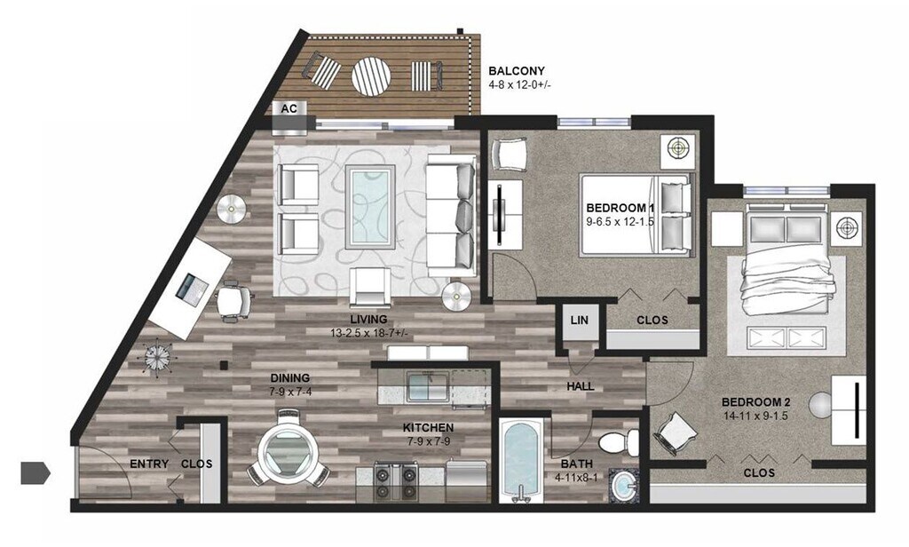 Modelo de apartamento: The Silver BirchLlame para Precios2 Dormitorios, 1 Baño, 835 sq ftNo Disponible![]()