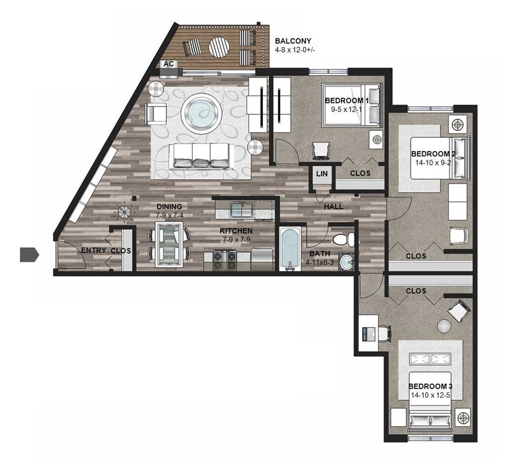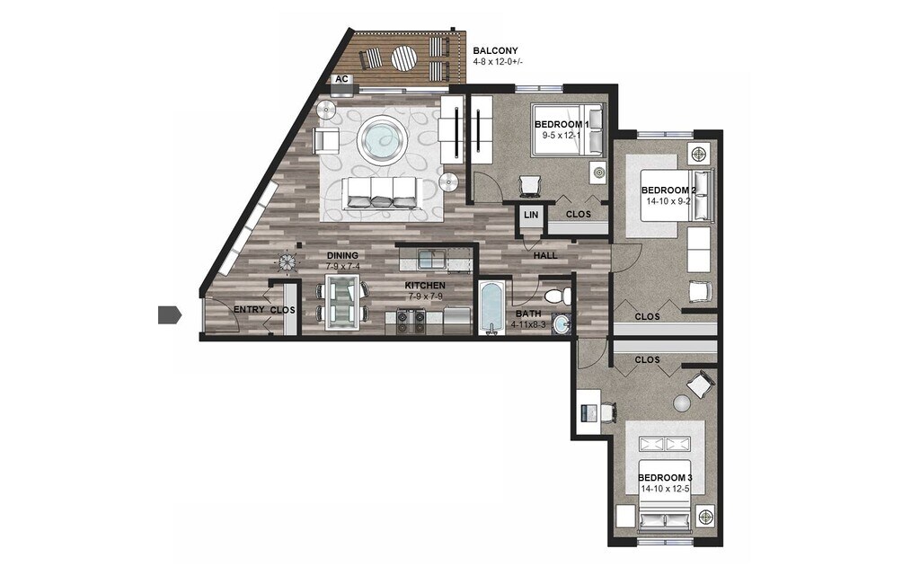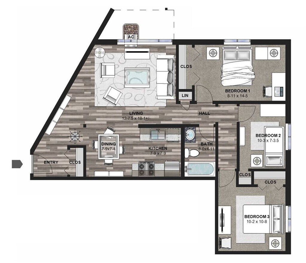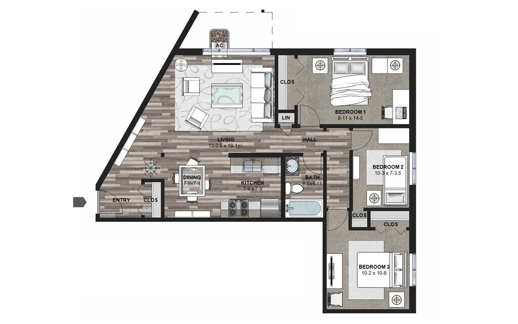 Modelo de apartamento: The Himalayan BirchLlame para Precios3 Dormitorios, 1 Baño, 1023 sq ftNo Disponible![]()