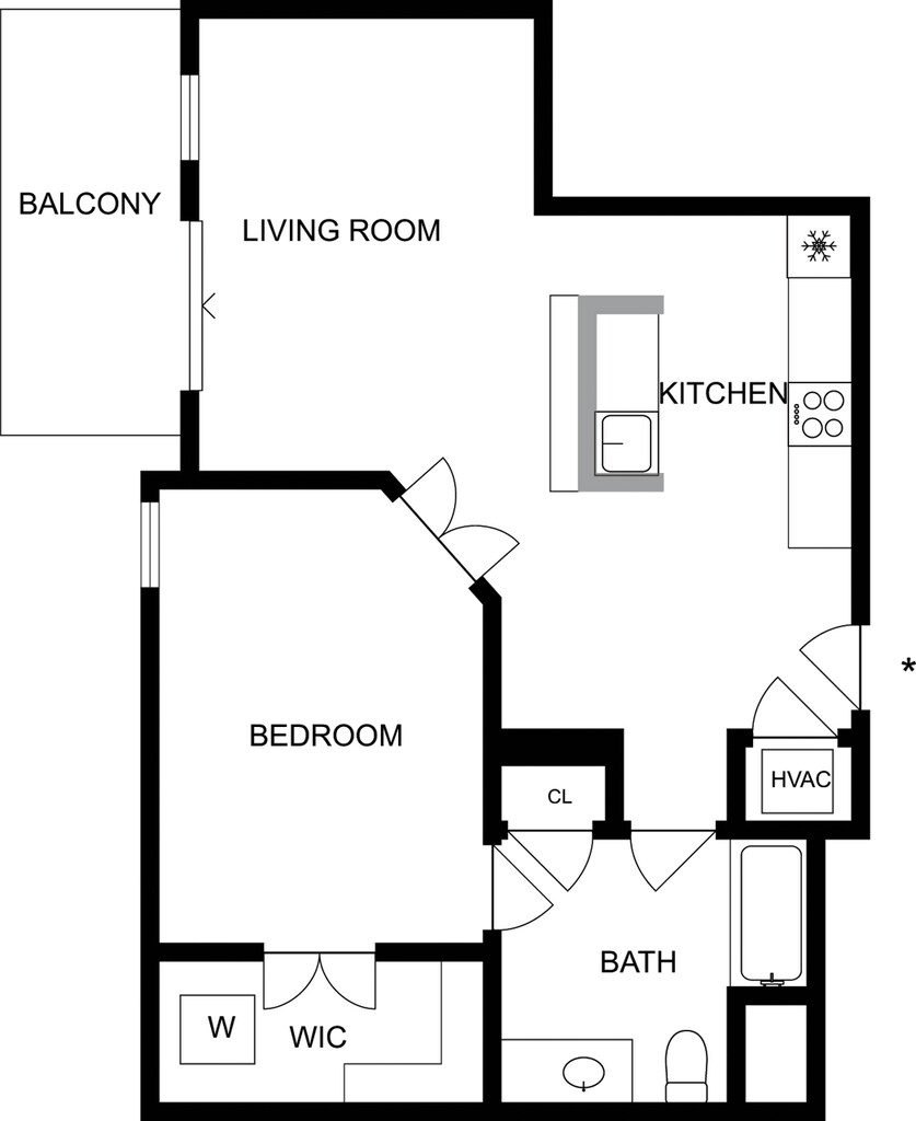 Modelo de apartamento: A02Desde $1,5341 Dormitorio, 1 Baño, 707 sq ftDisponible Ahora![]()