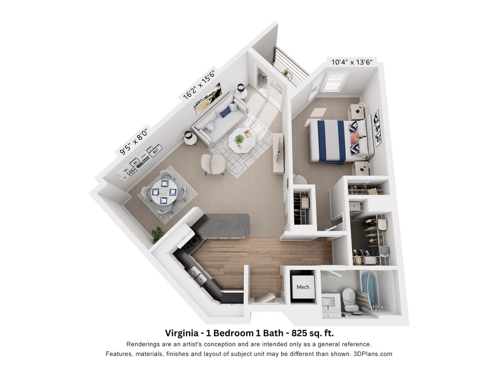 Virginia - 1BR 1B - Imagen 10 Los planos son representaciones artísticas. Todas las dimensiones son aproximadas. El producto y las especificaciones reales pueden variar en tamaño o detalle. No todas las características están disponibles en cada vivienda en alquiler. Por favor, consulta con un representante para obtener más detalles.