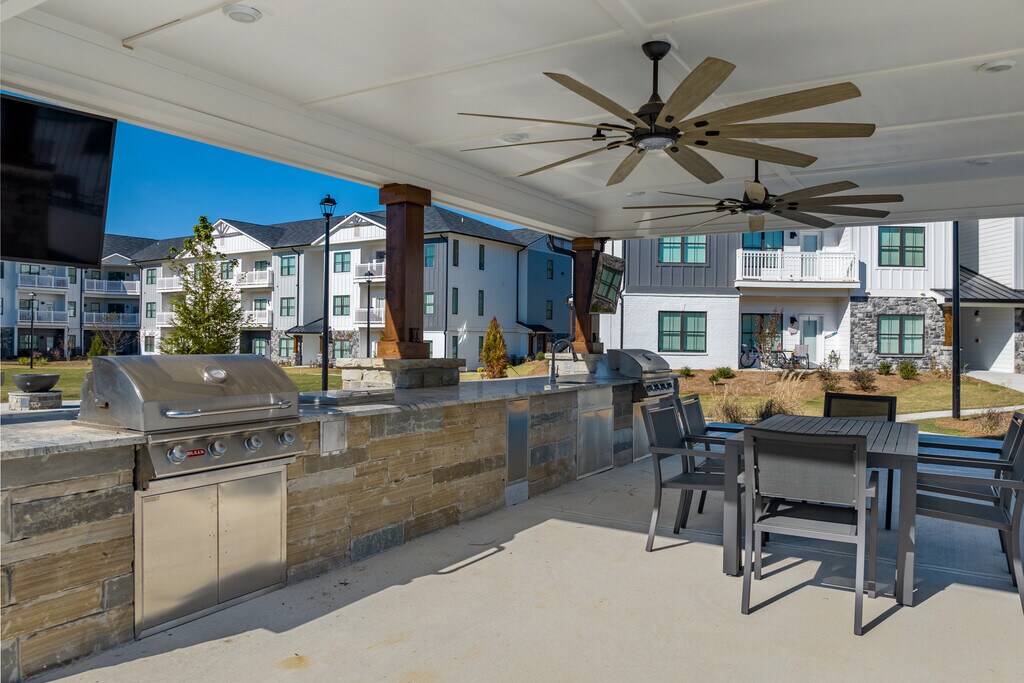 - Cocina al aire libre junto a la piscina con televisores