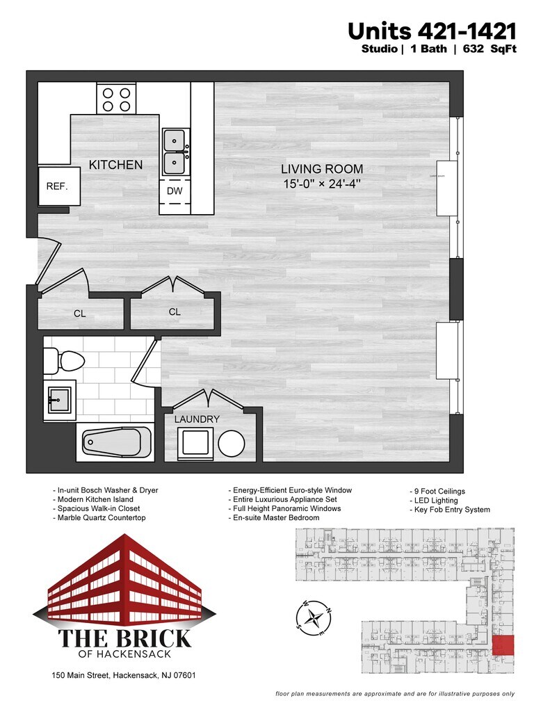 Disfruta de hermosas vistas, arquitectura moderna y comodidades pensadas al detalle en un exclusivo apartamento inspirado en Manhattan en The Brick. Ubicado en el corazón del centro de Hackensack, el complejo incluye un salón en la azotea con vistas panorámicas, estacionamiento en garaje, un oasis de piscina y aproximadamente 8,000 pies cuadrados de espacio para comercios a lo largo de Main Street. Únete a muchos otros para hacer de este moderno complejo tu nuevo hogar de lujo.