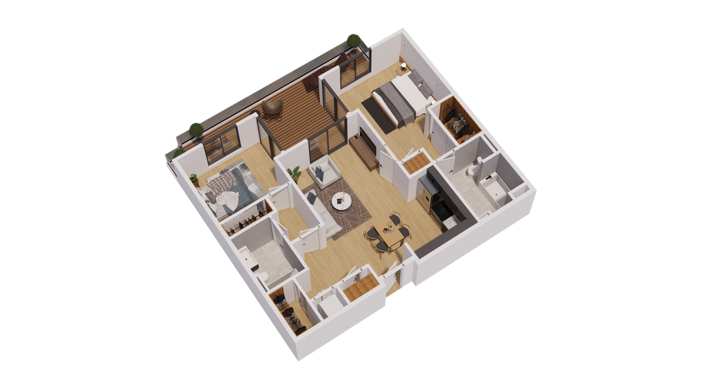 - Rooftop decks and lush landscapes throughout the property.