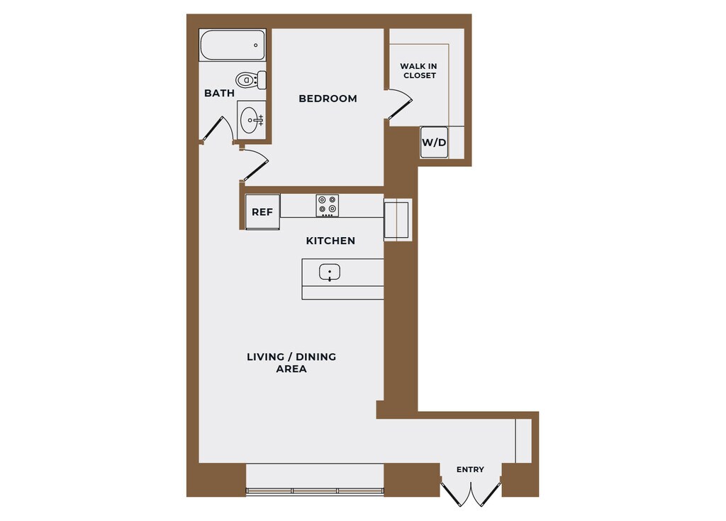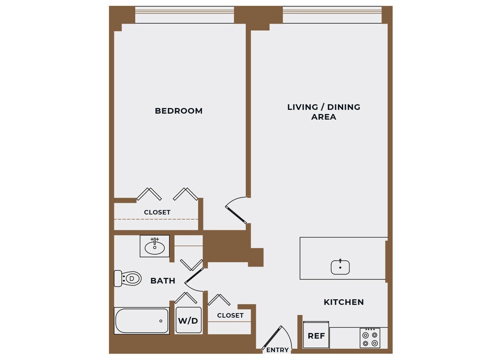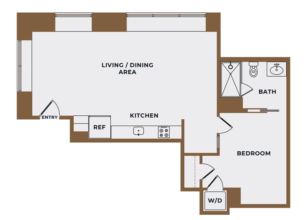 Modelo de apartamento: A1Llame para Precios1 Dormitorio, 1 Baño, 450 sq ftNo Disponible![]()