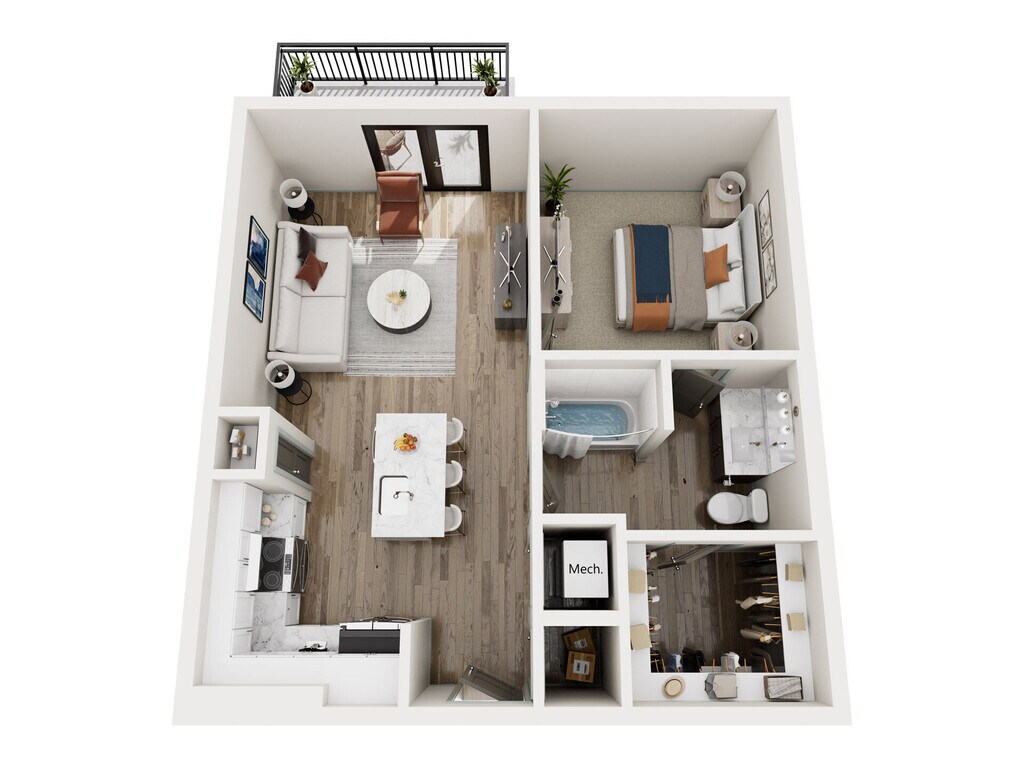 1 Dormitorio, 1 Baño, 821 pies²Disponible March 1, 2026Galería del Modelo