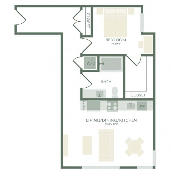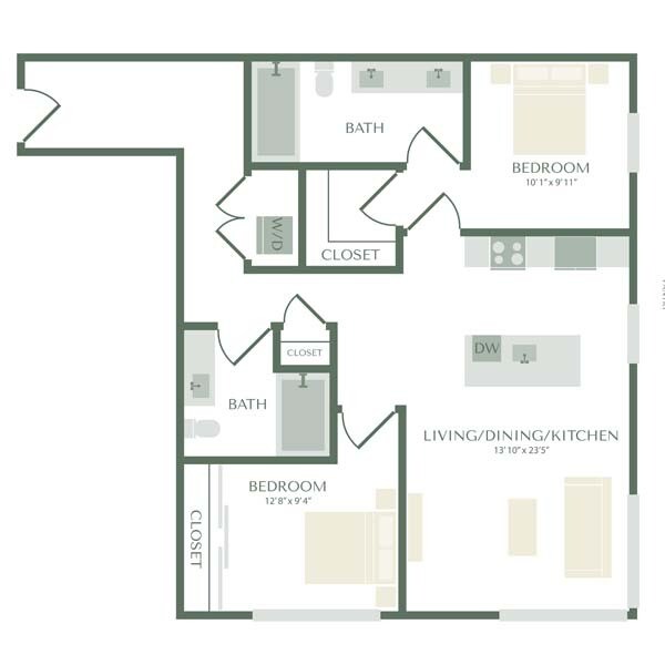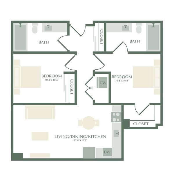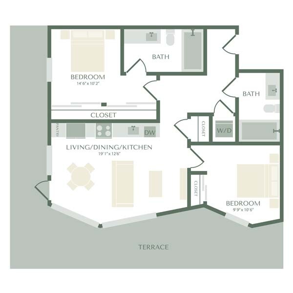 1 Dormitorio, 1 Baño, 770-818 pies²Disponible AhoraEl más grandeEsta opción tiene las unidades más grandes para este modeloGalería del Modelo