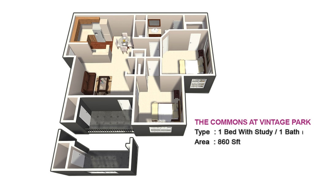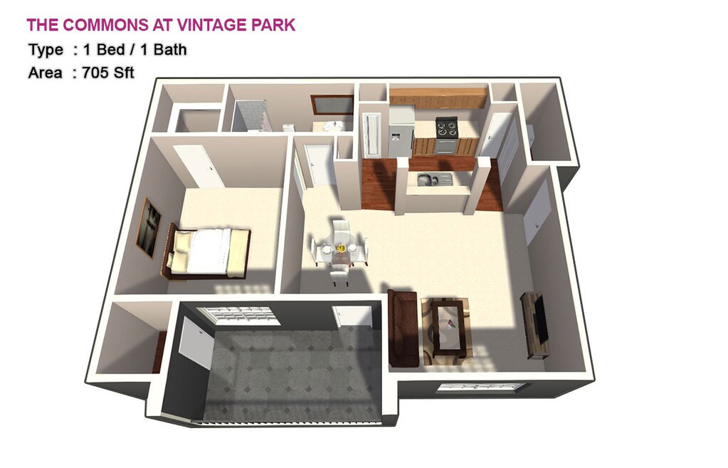 1 Dormitorio, 1 Baño, 689 pies²Disponible AhoraGalería del Modelo