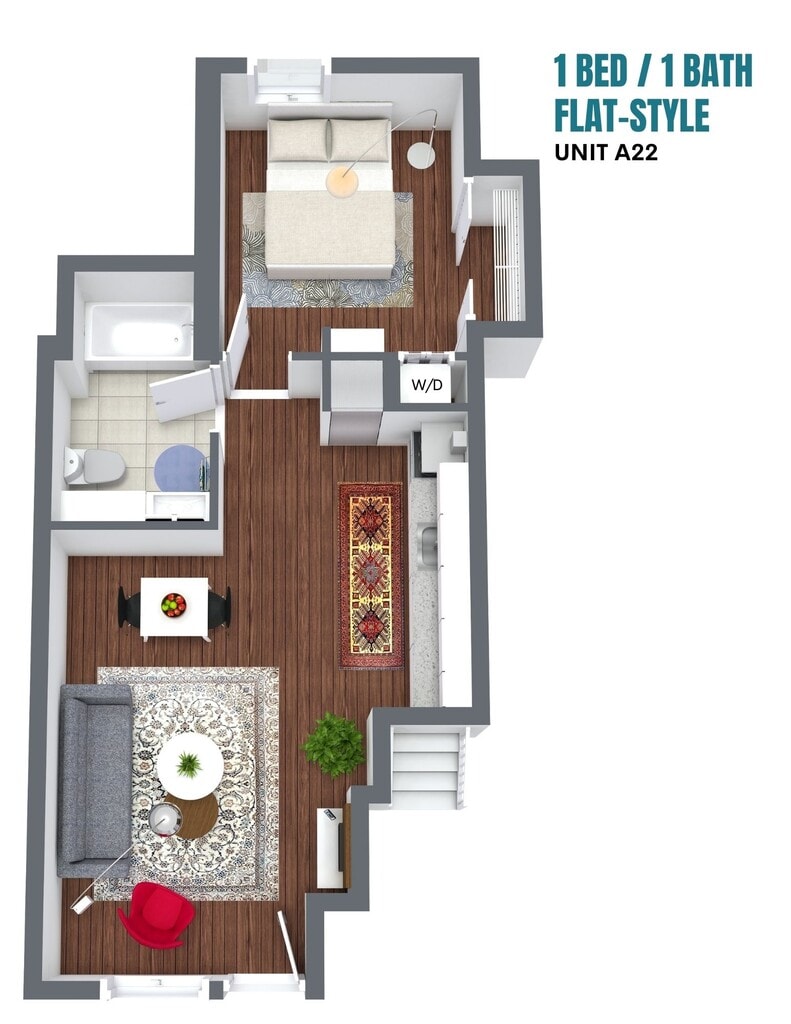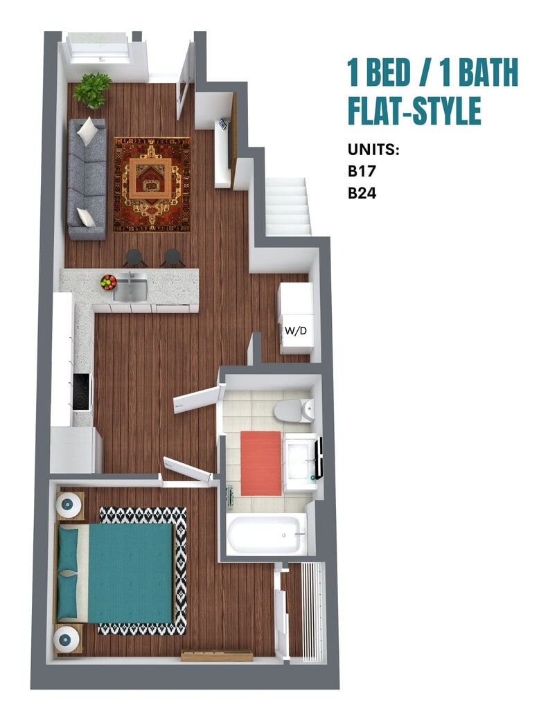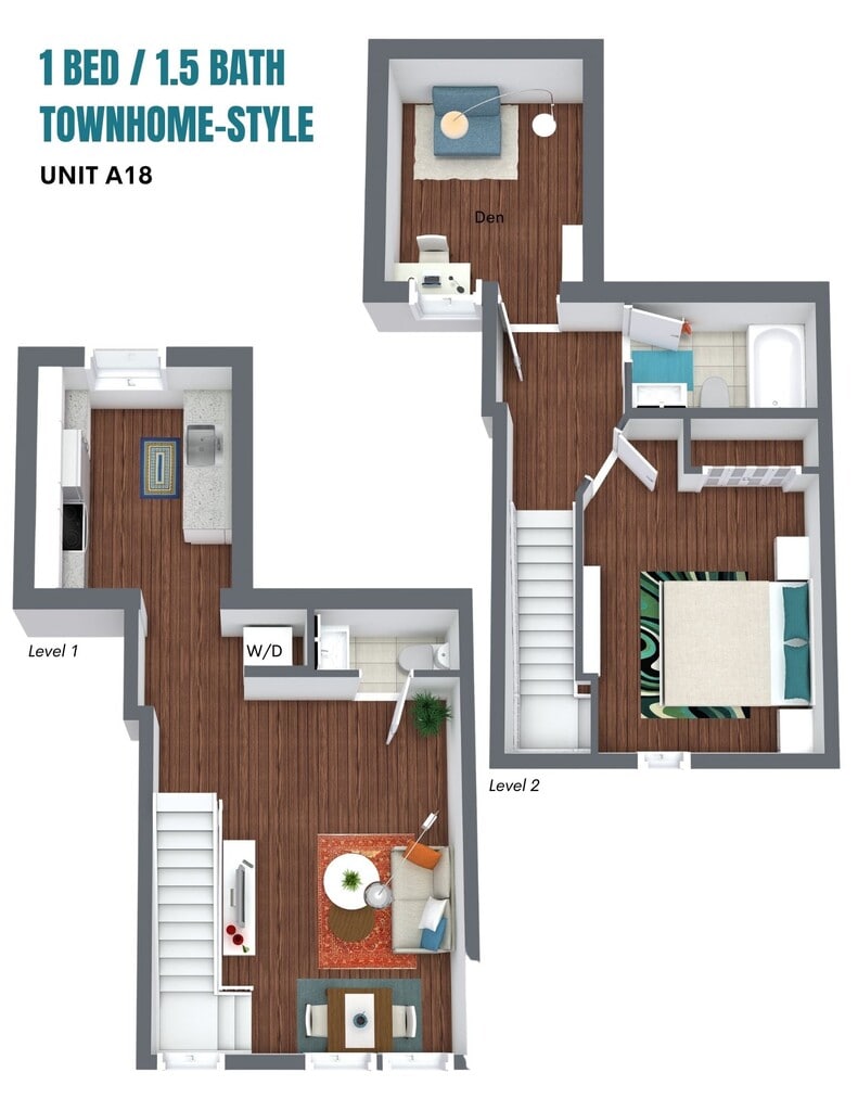 Modelo de apartamento: 1 Bedroom / 1 Bath: Townhome Style$1,1251 Dormitorio, 1 Baño, 730 sq ftDisponible Ahora![]()