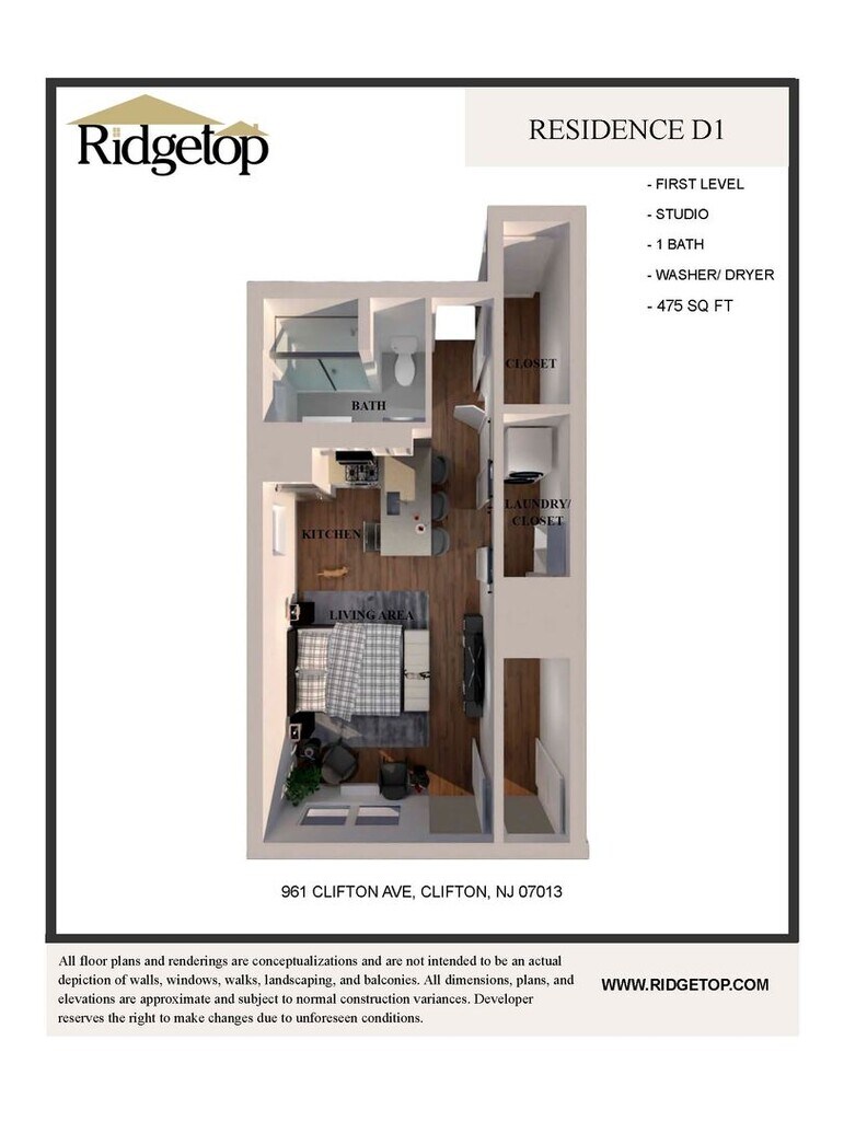 Unidad de apartamento: D01Modelo de apartamento: 0-1 (475) W/D 1st Floor$1,995Estudio, 1 Baño, 475 sq ftDisponible Ahora![]()